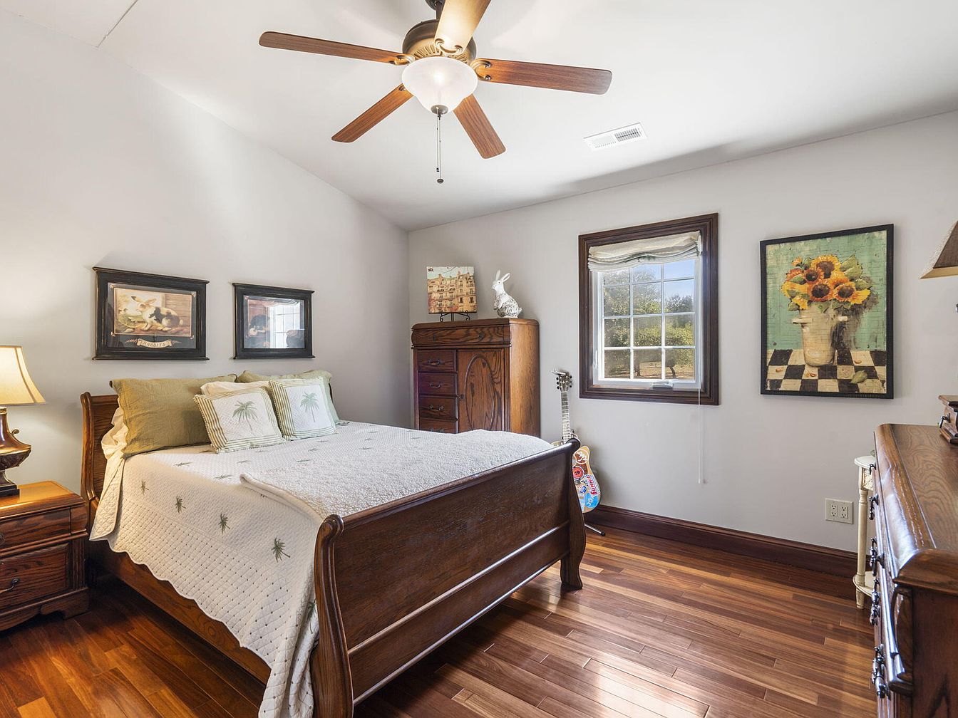 This inviting bedroom features rich hardwood flooring and a wooden sleigh bed adorned with a light, palm tree-embroidered quilt and matching throw pillows for a relaxed, tropical touch. Soft neutral walls allow the dark-stained furniture, including nightstands and a tall chest of drawers, to stand out, creating a timeless aesthetic. The large window, framed with deep wood trim, brings in abundant natural light, enhancing warmth and airiness. Family-friendly elements include ample floor space, comfortable bedding, a ceiling fan for comfort, and cheerful, whimsical wall art, such as sunflowers and animal paintings, making the room perfect for relaxation and restful family nights.