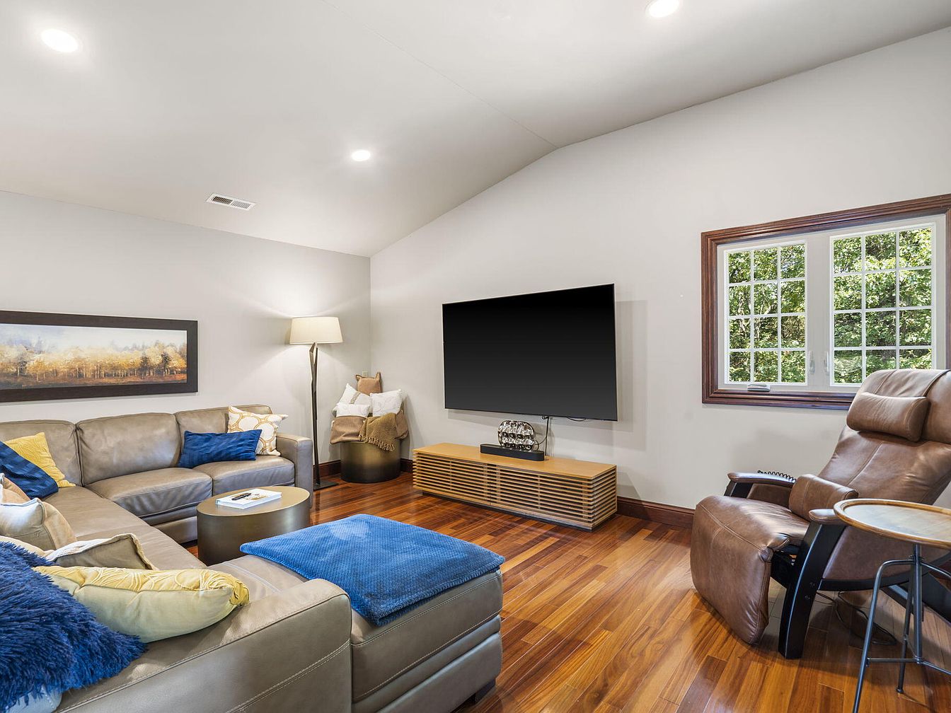 A spacious living room with an inviting, open layout designed for family gatherings and relaxation. Large, comfortable sectional couches in warm beige tones are accented with plush blue and yellow throw pillows and blankets, offering cozy seating for everyone. A sleek, modern entertainment center supports a large wall-mounted television, ideal for movie nights. Beautifully polished wood floors and a wood-framed window bring warmth and natural light into the space, while a leather recliner and round accent tables add further comfort and functionality. Soft neutral wall colors, contemporary artwork, and gentle recessed lighting create a calming, welcoming atmosphere for all ages.