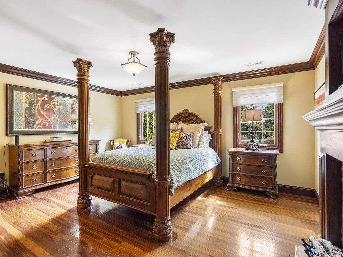 This spacious primary bedroom features a grand four-poster wooden bed as the focal point, surrounded by matching dark wood furniture including a nine-drawer dresser and a pair of elegant nightstands. Large windows with wood trim fill the room with natural light, highlighting the glossy hardwood floors and creating a warm, inviting atmosphere. Soft yellow walls provide a soothing backdrop, while crown molding adds a touch of classic sophistication. Decorative pillows and comfortable bedding ensure family-friendly comfort, and there’s plenty of space for children or pets to move around safely. A cozy reading chair in the corner finishes the welcoming design.