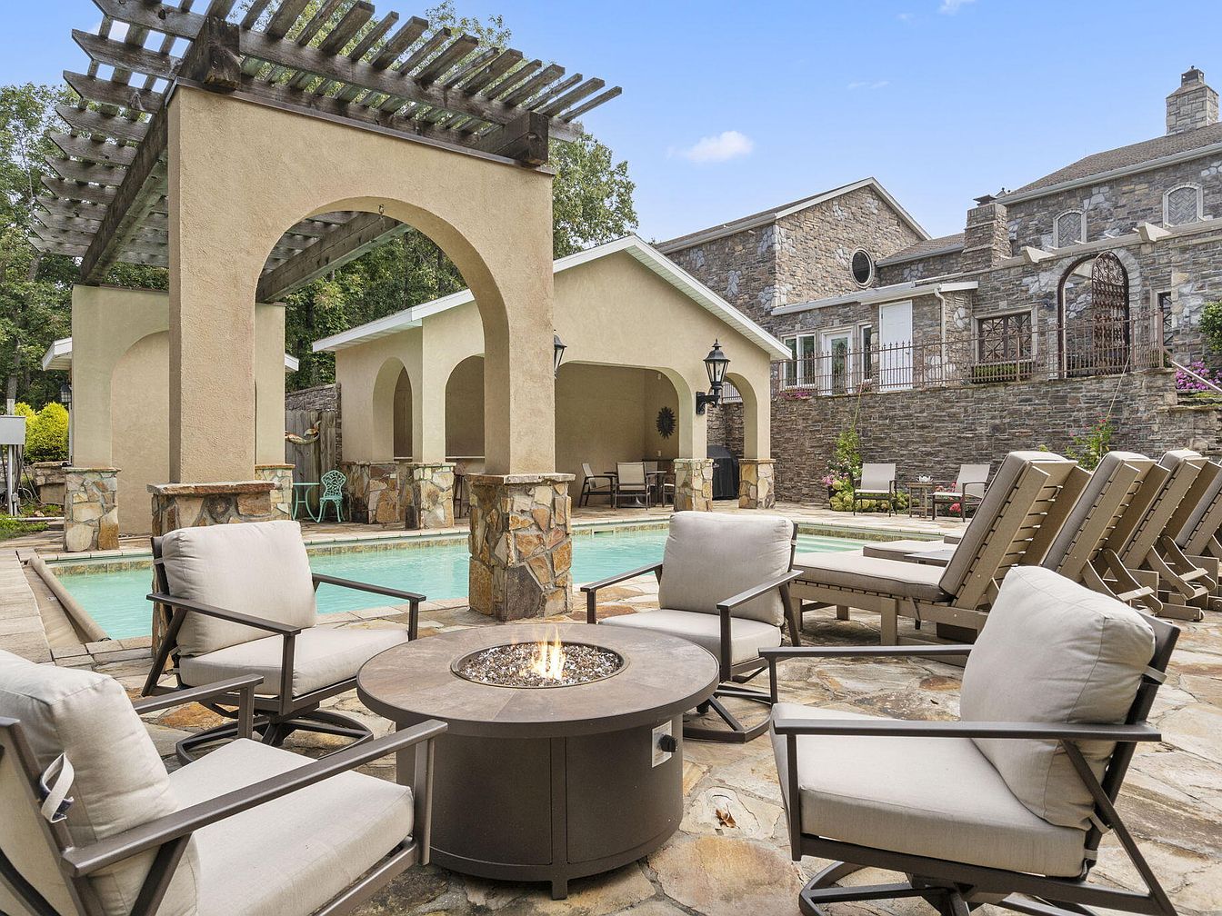 This inviting outdoor patio and pool area features a charming stone and stucco structure with arched openings and a wooden pergola above, creating both shade and architectural interest. Ample cushioned lounge chairs and a circular fire pit surrounded by comfortable armchairs encourage family gatherings and relaxing evenings. The pool, edged with natural stone, is easily accessible and provides a safe, open space for children to swim and play. Neutral earth tones and soft beige dominate the color palette, harmonizing with the stone accents and surrounding greenery. The area blends comfort, safety, and style, making it exceptionally family-friendly.