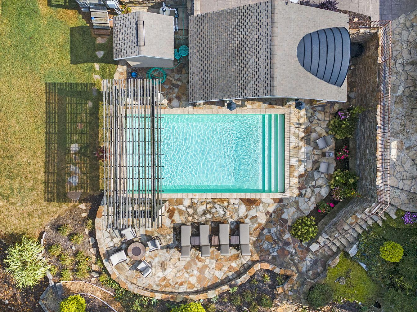 A beautifully designed backyard oasis featuring a rectangular swimming pool at the center, bordered by natural stone tiles. The pool is surrounded by various seating areas including cushioned lounge chairs and an area with a round fire pit encircled by armchairs, offering plenty of space for relaxation and gatherings. Lush landscaping, with vibrant green grass, shrubs, and blooming flowers, adds to the family-friendly ambiance. The area includes a shaded pergola structure, providing relief from the sun, and the hardscaping creates a safe, non-slip surface. The harmonious blend of earth tones and rich textures complements the inviting, functional design ideal for family enjoyment.