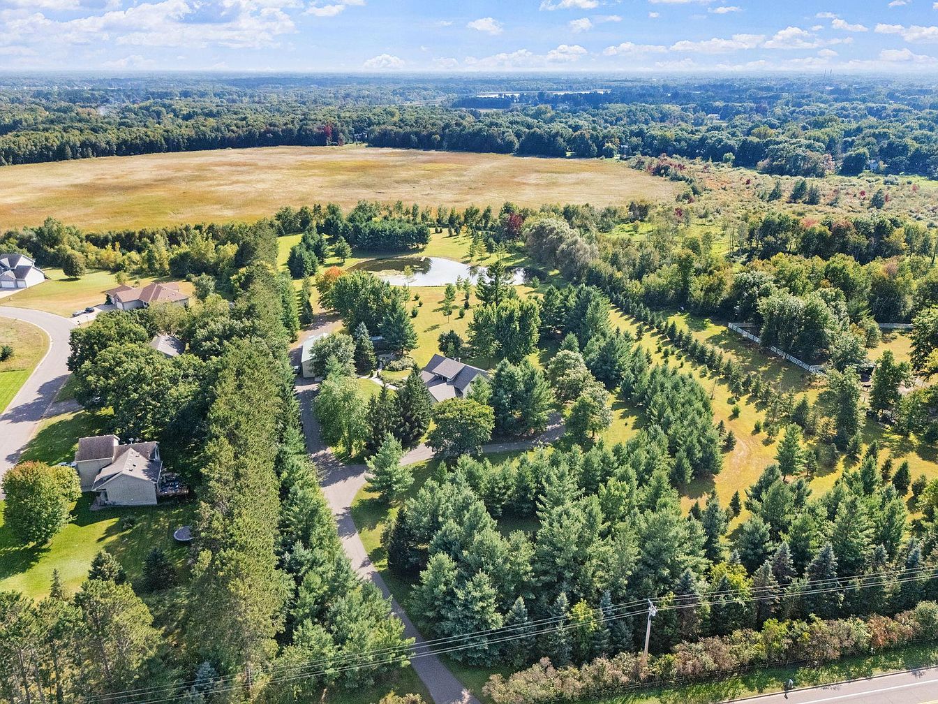 A sweeping aerial perspective showcases a tranquil residential neighborhood nestled amidst lush greenery and open fields. Spacious lots with family homes are surrounded by mature trees for privacy and natural beauty. Wide, gently curving roads provide easy access throughout the community, while large grassy yards invite outdoor play for children and gatherings. Rows of evergreens line the properties, enhancing seclusion and offering year-round color. In the distance, a small pond reflects the sky and is bordered by more trees, promising peaceful views and opportunities for recreation. Overall, the landscape combines safe, wide-open spaces with a harmonious blend of nature and family-focused living.