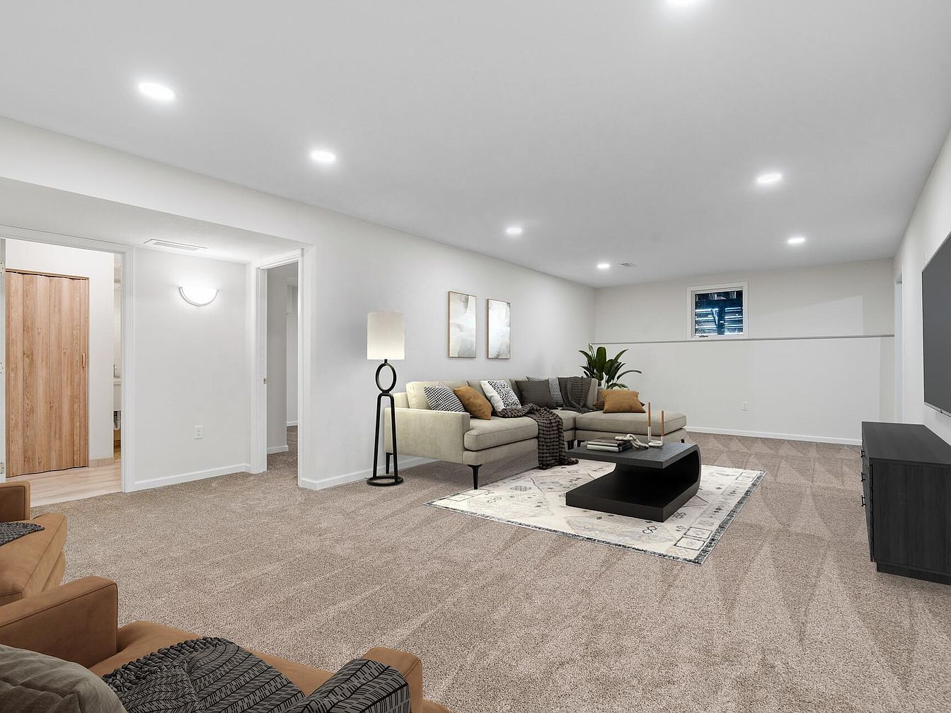 A spacious basement family room features a plush taupe carpet that covers the entire floor, ideal for children to safely play or for lounging as a group. The inviting L-shaped sectional sofa, adorned with neutral throw pillows and blankets, anchors the main living space. A modern black rectangular coffee table sits atop a cream area rug with subtle patterns, providing a gathering spot for games or family movie nights. Soft white walls, recessed ceiling lights, and a large flat-screen TV mounted on a dark credenza enhance comfort. Minimalist wall art, an indoor plant, and a floor lamp complete the cozy, family-friendly ambiance.