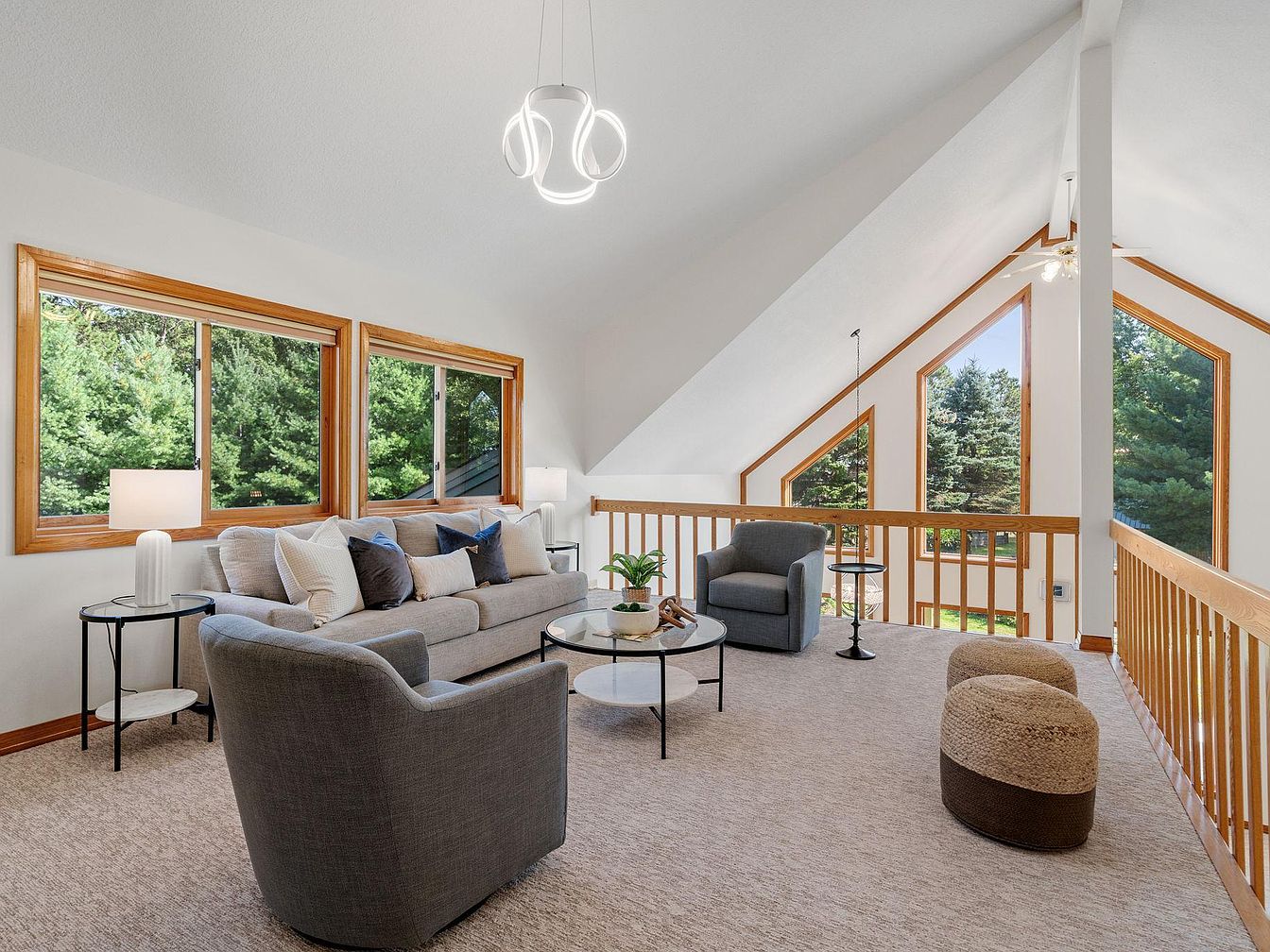A spacious loft sitting area with plush, light-gray carpet and abundant natural light streaming in from large windows with warm wood trim. The space is arranged with a comfortable, neutral-toned sectional sofa accented by soft throw pillows in shades of cream, navy, and beige, creating a cozy and inviting atmosphere for families. Two cushioned armchairs and a pair of textured poufs provide ample seating for gatherings or quiet reading. A contemporary round coffee table and modern accent tables with sleek lines enhance the setting, while updated pendant lighting adds an artistic touch. Safe railing and open sightlines ensure easy supervision and family-friendly appeal.