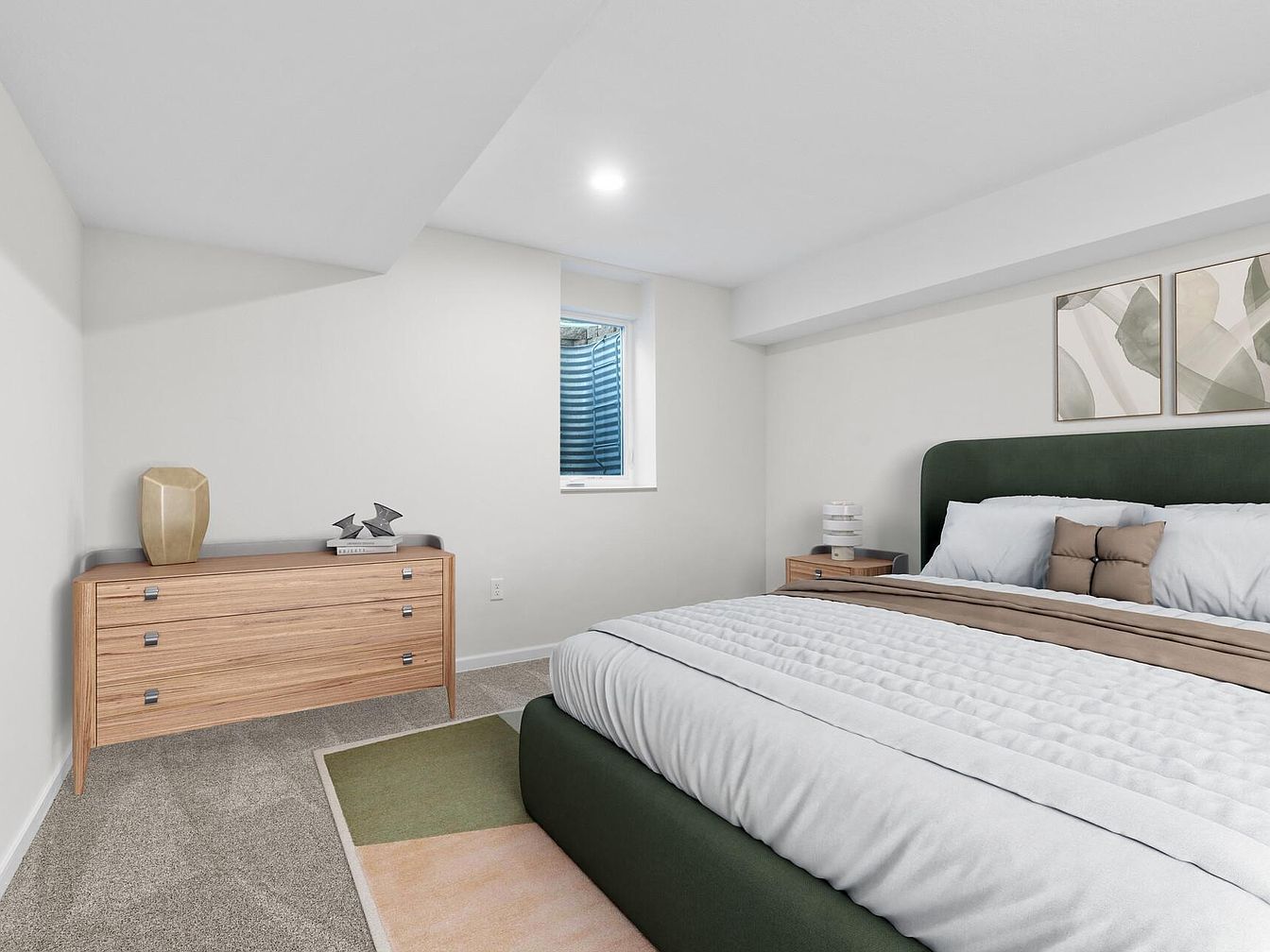 Spacious and bright, this bedroom features a large window and a neutral color palette that creates a welcoming feel for families. The soft, light carpeting adds warmth and comfort underfoot, ideal for children or anyone seeking a cozy retreat. A dark wooden bed frame anchors the room, complemented by a simple bedside table holding a small plant, adding a touch of greenery. Pale off-white walls are bordered by natural wood trim, creating a harmonious transition between wall and floor. The room’s clean layout offers plenty of open space, perfect for flexible layouts, play areas, or additional furniture. Natural light fills the space, enhancing the inviting atmosphere.