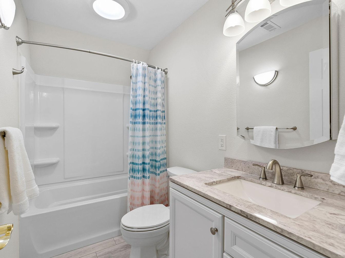 This bright and modern bathroom features a clean, family-friendly layout with a spacious shower-tub combination, ideal for both children and adults. The curved shower rod creates extra space, while built-in shelving offers convenient storage for bath essentials. Light-colored walls and matching cabinetry keep the space airy, enhanced by a sleek marble-look countertop. A wide rectangular sink with brushed nickel fixtures adds elegance, complemented by a large mirror and stylish overhead lighting. The soft-hued shower curtain features a blue and peach pattern, adding a gentle pop of color. Durable, wood-style flooring completes the functional and inviting atmosphere.