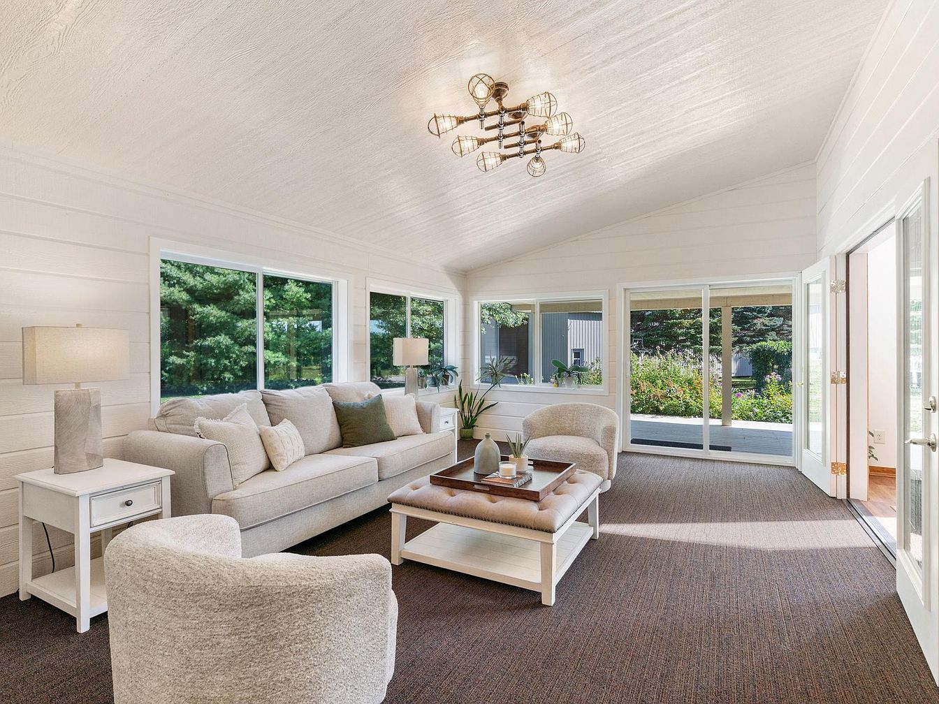 A spacious sunroom filled with natural light, featuring a vaulted white paneled ceiling and four large windows offering lush garden views. Comfortable, light-colored furniture includes a plush sofa adorned with cozy pillows, two rounded armchairs, and a soft, upholstered coffee table atop a white wooden base. Side tables with calming lamps flank the sofa, creating a relaxing atmosphere, while glass doors open directly to a garden, encouraging indoor-outdoor living. The subtle, neutral color palette paired with warm brown flooring makes this room family-friendly, ideal for gatherings or quiet afternoons together, fostering a welcoming and safe space for all ages.