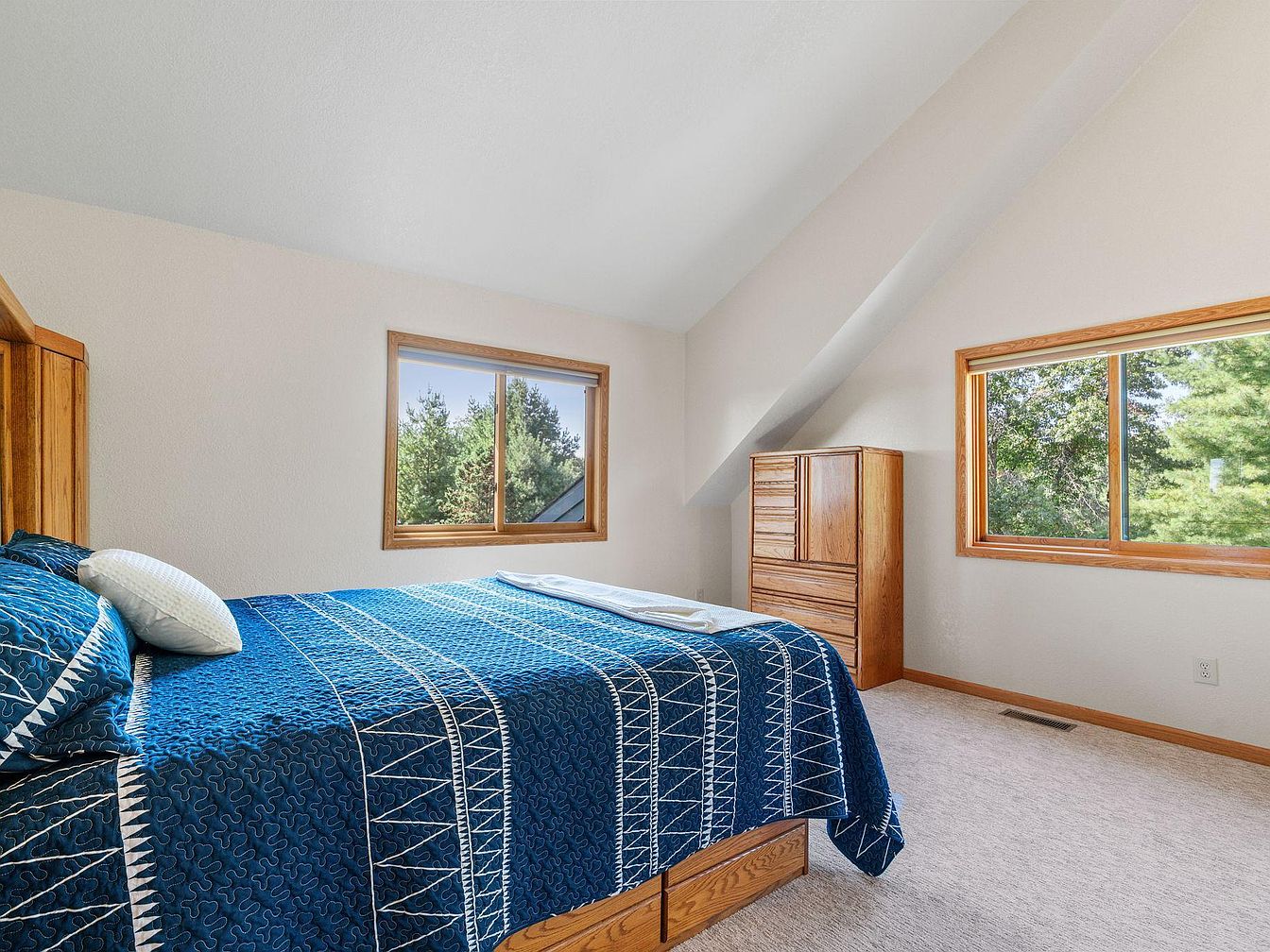 A spacious bedroom with sloped ceilings features two large windows framed in natural wood, allowing abundant sunlight and views of mature green trees—a welcoming, serene setting for any family. The room is dominated by a comfortable wooden bed with storage drawers beneath and a bright blue, geometric-patterned bedspread, accompanied by matching pillows. Neutral beige carpeting and cream-colored walls contribute to a calm and cozy atmosphere. A tall wooden chest of drawers provides generous storage, keeping the area tidy and organized. The design prioritizes open space and accessibility, making it a safe, inviting retreat for both children and adults.
