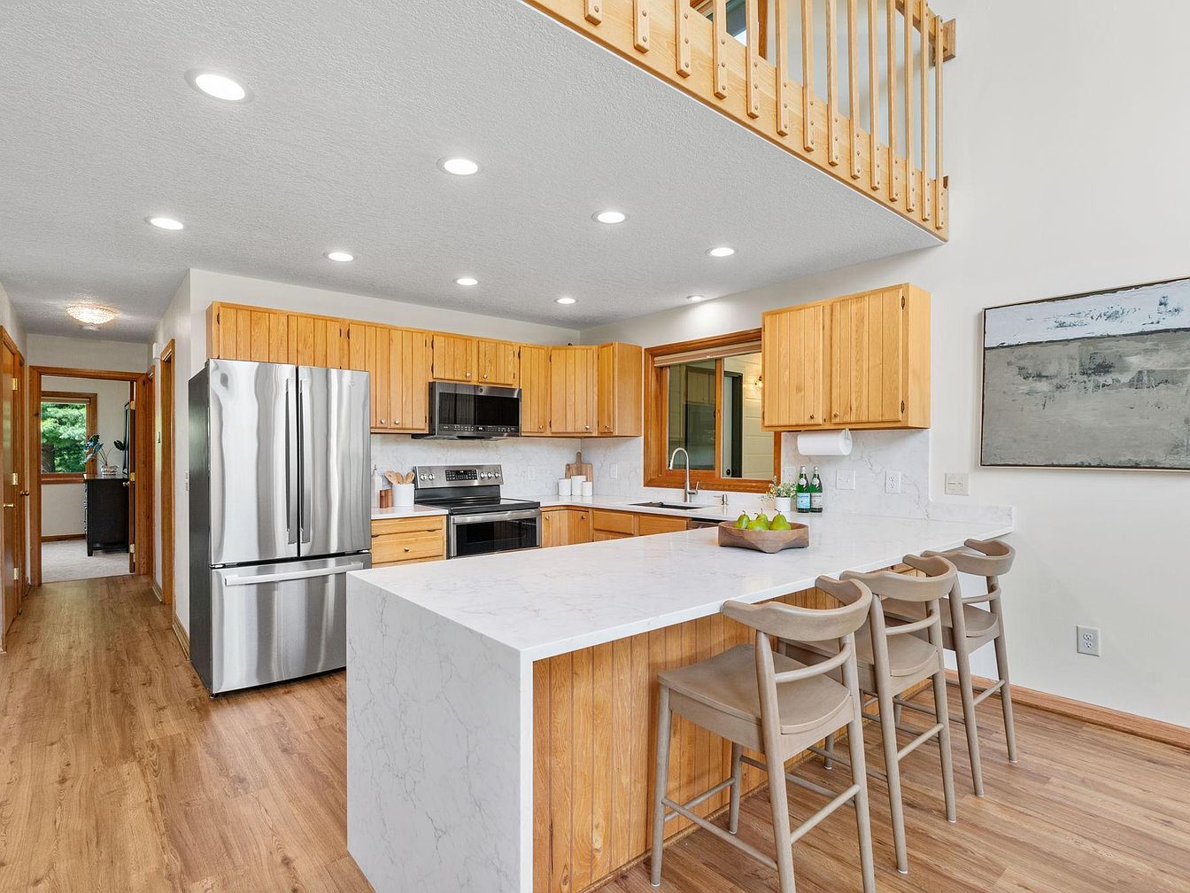 Spacious kitchen featuring a large white marble island with ample seating for three, perfect for family gatherings and casual meals. Contemporary natural wood cabinets line the walls, paired with state-of-the-art stainless steel appliances including a double-door refrigerator, oven, and built-in microwave. The open layout flows seamlessly into surrounding living spaces, encouraging interaction and visibility—ideal for parents keeping an eye on children. Warm wood flooring adds comfort and durability, complemented by soft neutral walls and minimalist décor. Overhead recessed lighting ensures excellent visibility, while a nearby loft with wood railing adds architectural interest and an airy feeling throughout the room.