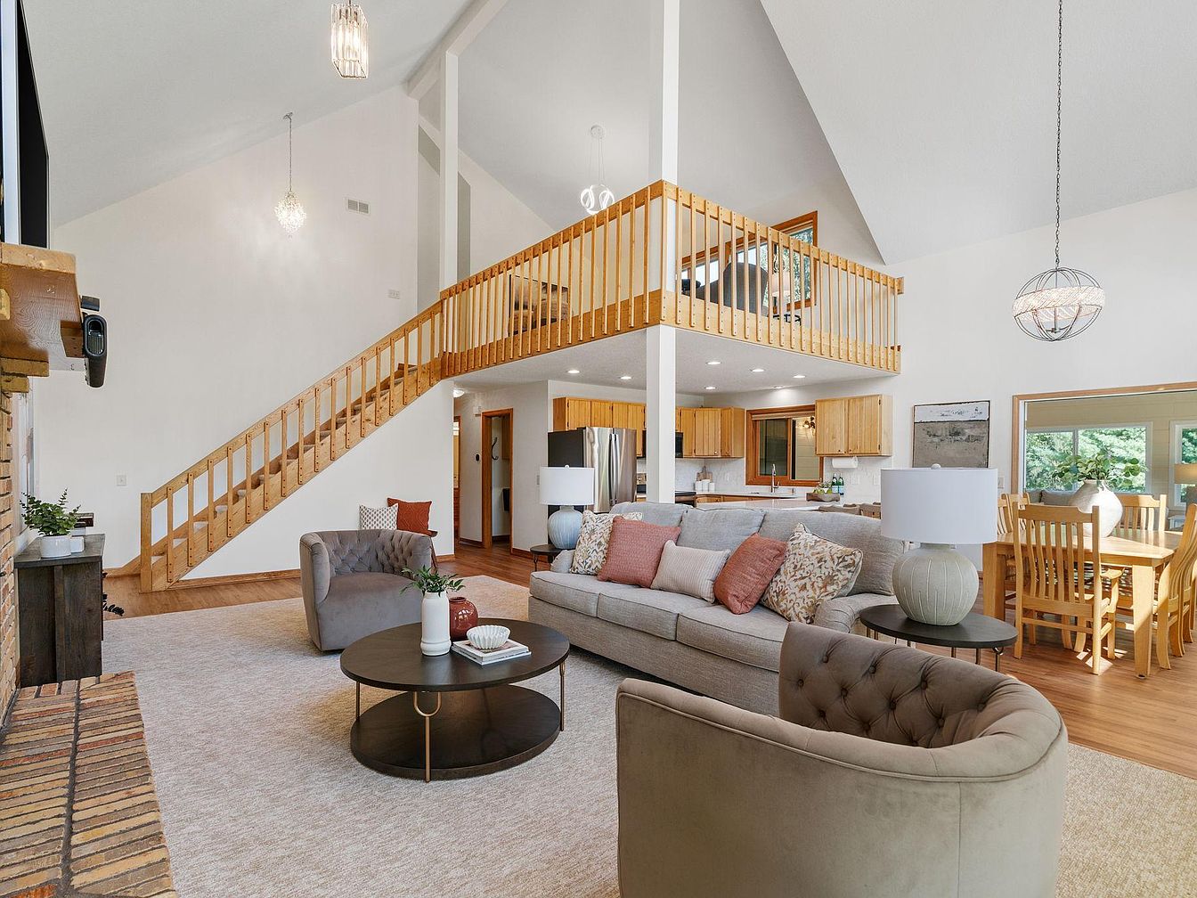 A spacious, open-concept living area with high vaulted ceilings and abundant natural light, ideal for family gatherings. The design features a cohesive color palette of soft neutrals and warm wood tones, with a light beige carpet complementing natural wood floors and trim. A contemporary gray sofa and two plush, tufted chairs are arranged around a modern black coffee table. Sturdy wooden banisters frame the staircase and upper loft, offering safe and visible boundaries for children. The area seamlessly flows into a bright kitchen with light-colored cabinetry and a generous dining space, creating an inviting, multi-functional environment for family life.