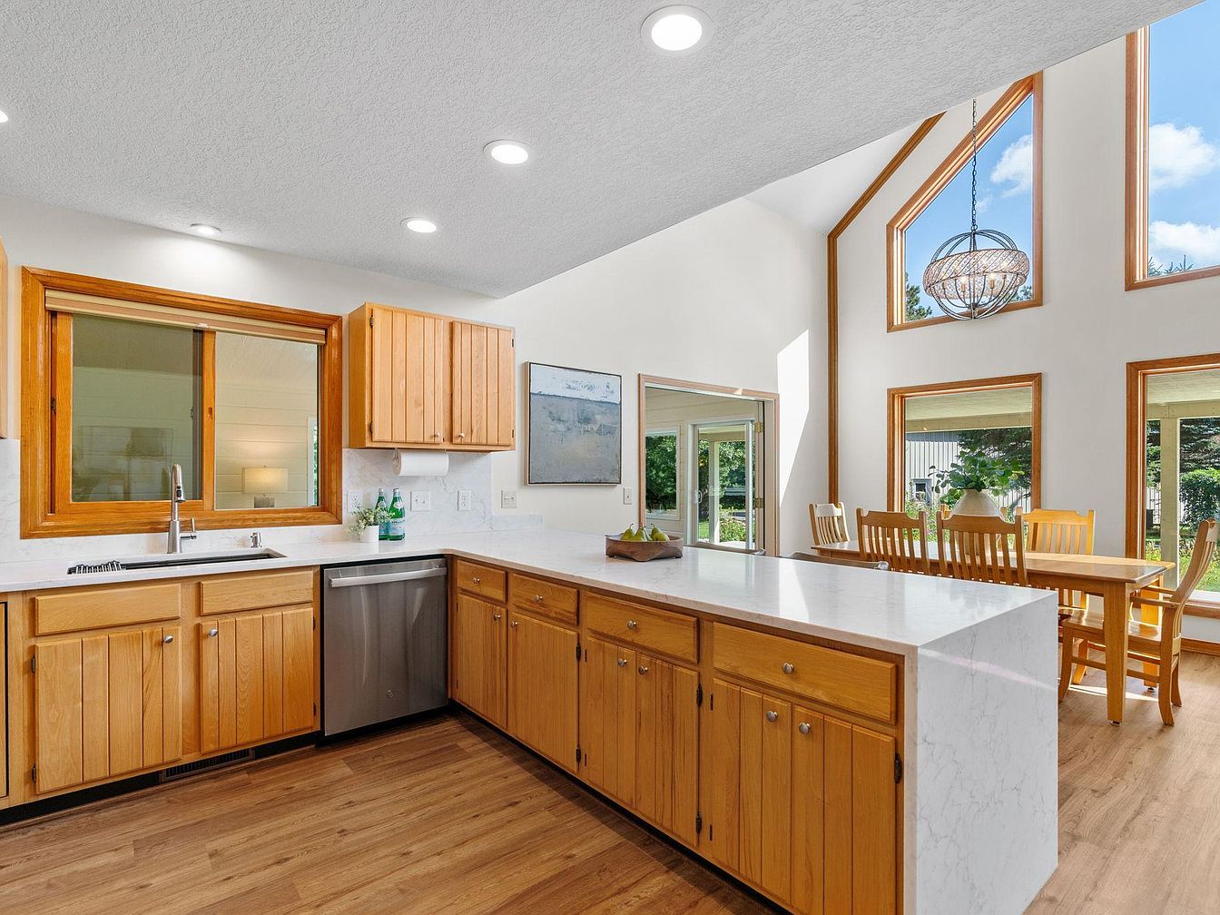A spacious kitchen opens directly into a bright dining area, creating an inviting family-friendly space perfect for gatherings. Natural wood cabinetry and matching window frames add warmth, while sleek white marble countertops provide a clean, modern touch. The stainless steel dishwasher and deep sink under a large window offer practicality and ample daylight. The dining area features a long wooden table with high-back chairs and is illuminated by oversized windows and a striking spherical chandelier. Light wood floors flow seamlessly throughout, complementing the neutral walls and supporting an airy, welcoming atmosphere ideal for both daily living and entertaining family or friends.