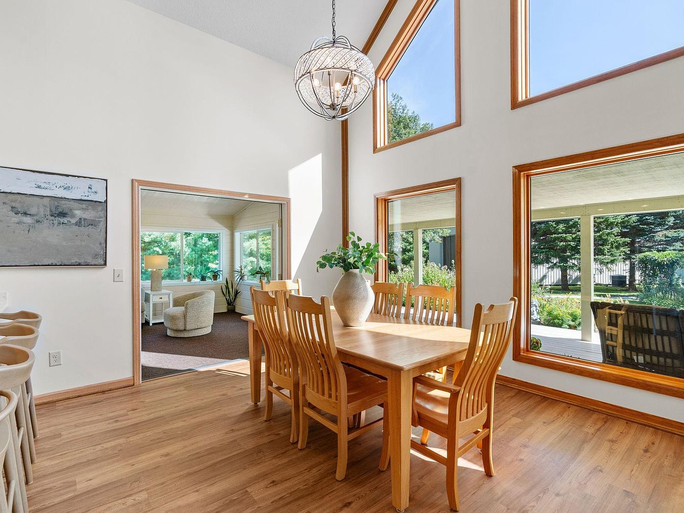 A bright, welcoming dining area with soaring ceilings and large, geometrically arranged windows that allow abundant natural light to flood the space and offer panoramic views of lush greenery outside. The centerpiece is a long wooden dining table surrounded by matching wooden chairs, providing ample seating for family gatherings. The color palette is composed of warm honey-toned wood and crisp white walls, creating an inviting and contemporary feel. An elegant round chandelier hangs overhead, adding a touch of sophistication. Open sightlines flow seamlessly into a sunroom with cozy seating, ideal for family relaxation, play, or entertaining guests.