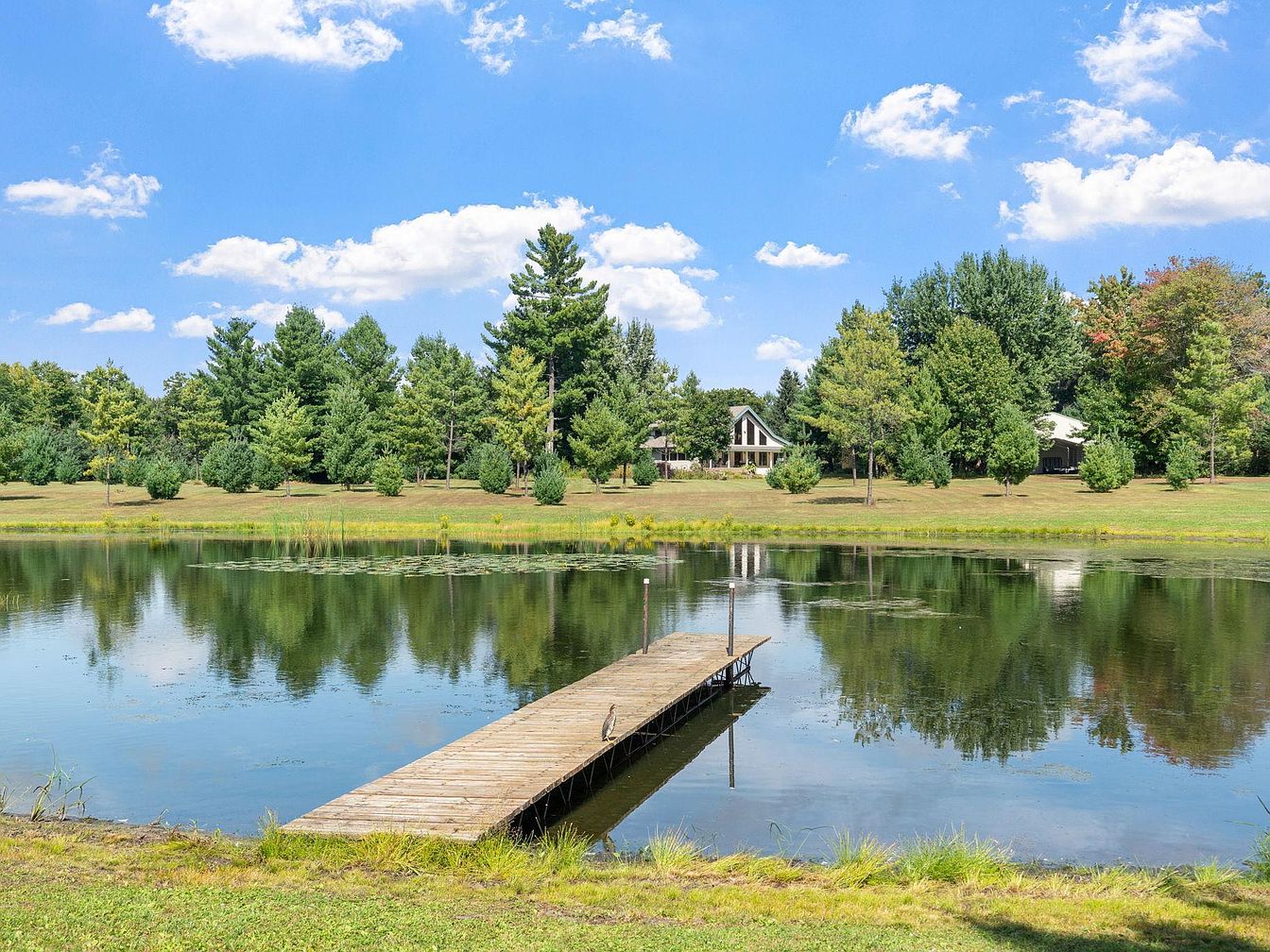 A serene and spacious backyard features a calm private pond, bordered by lush green grass and mature trees, reflecting the vibrant blue sky and fluffy white clouds above. At the edge of the pond, a wooden dock extends into the water, offering a perfect spot for family fishing or quiet moments outdoors. The landscape is open and inviting, ideal for picnics, children’s play, and outdoor activities. In the distance, a charming house with large windows and a generous front porch sits nestled amongst tall evergreens, providing a picturesque and peaceful setting for family living with plenty of opportunities for outdoor adventures.