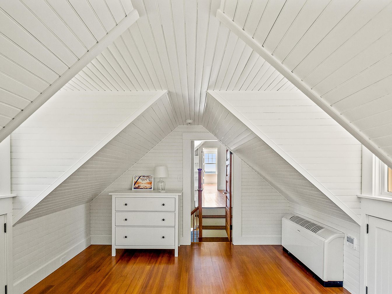 This attic space features a bright and airy atmosphere with gabled ceilings that highlight the slanted wooden beams. The walls and ceiling are finished in crisp white, enhancing the light reflection and making the area feel more spacious. Dark, polished hardwood flooring contrasts beautifully with the walls, providing warmth. A simple white dresser sits against the wall, adorned with a small lamp and a book, adding to the minimalistic decor. Light streams in through strategically placed windows, offering picturesque views and softening the starkness of the white. Overall, the space embodies a modern rustic charm.