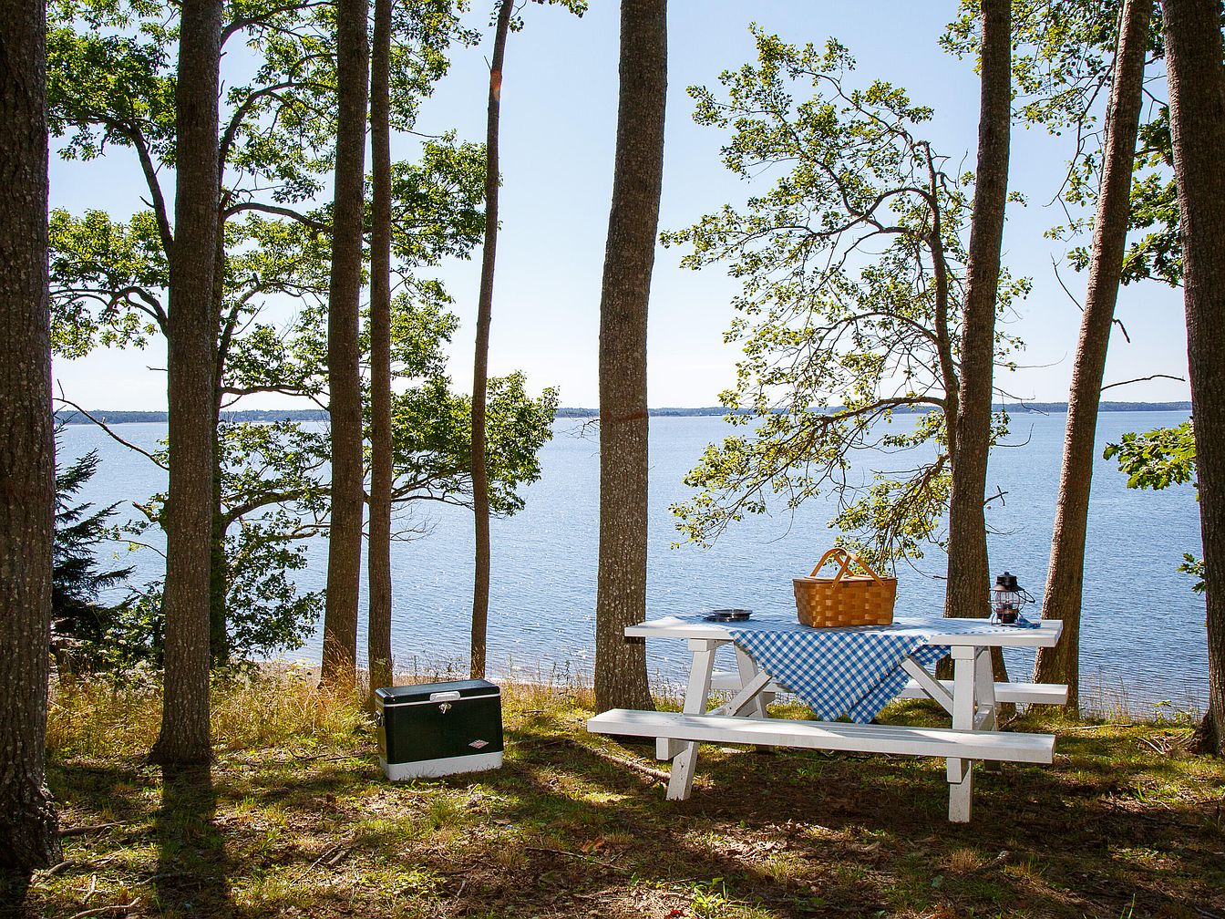 A serene picnic area nestled among tall trees, overlooking a tranquil body of water. A classic white picnic table is adorned with a blue and white checkered tablecloth, inviting a casual dining experience. Nearby, a wicker basket and a vintage lantern add rustic charm. A dark green cooler contrasts with the natural surroundings, providing practicality. The gentle sway of leaves and dappled sunlight create a relaxed atmosphere. The still water in the background mirrors the clear blue sky, enhancing the peaceful ambiance. Tall trees form a natural frame, creating an idyllic retreat for relaxation and enjoyment.