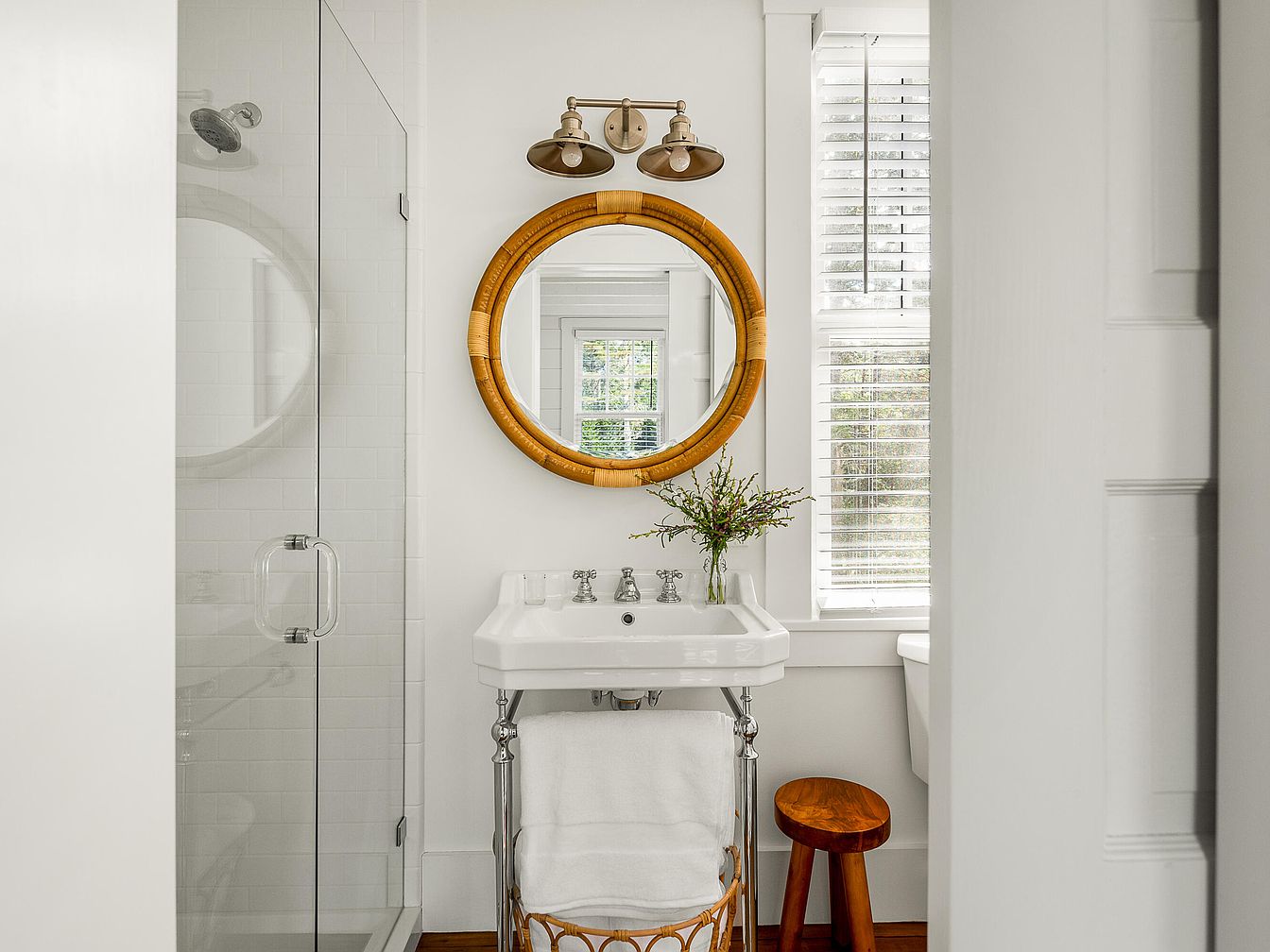This bathroom features crisp white walls and sleek tile, creating a fresh atmosphere. A frameless glass shower showcases modern design, while a round, rattan-framed mirror adds a touch of warmth. Below the mirror, a vintage-style pedestal sink stands with polished chrome fixtures, enhancing its timeless appeal. A small wooden stool provides functional seating, emphasizing natural materials. Natural light streams in through a window, illuminating a delicate vase with greenery, harmonizing with the neutral color scheme. The overall aesthetic combines modern simplicity with rustic elements, crafting a serene and inviting sanctuary.