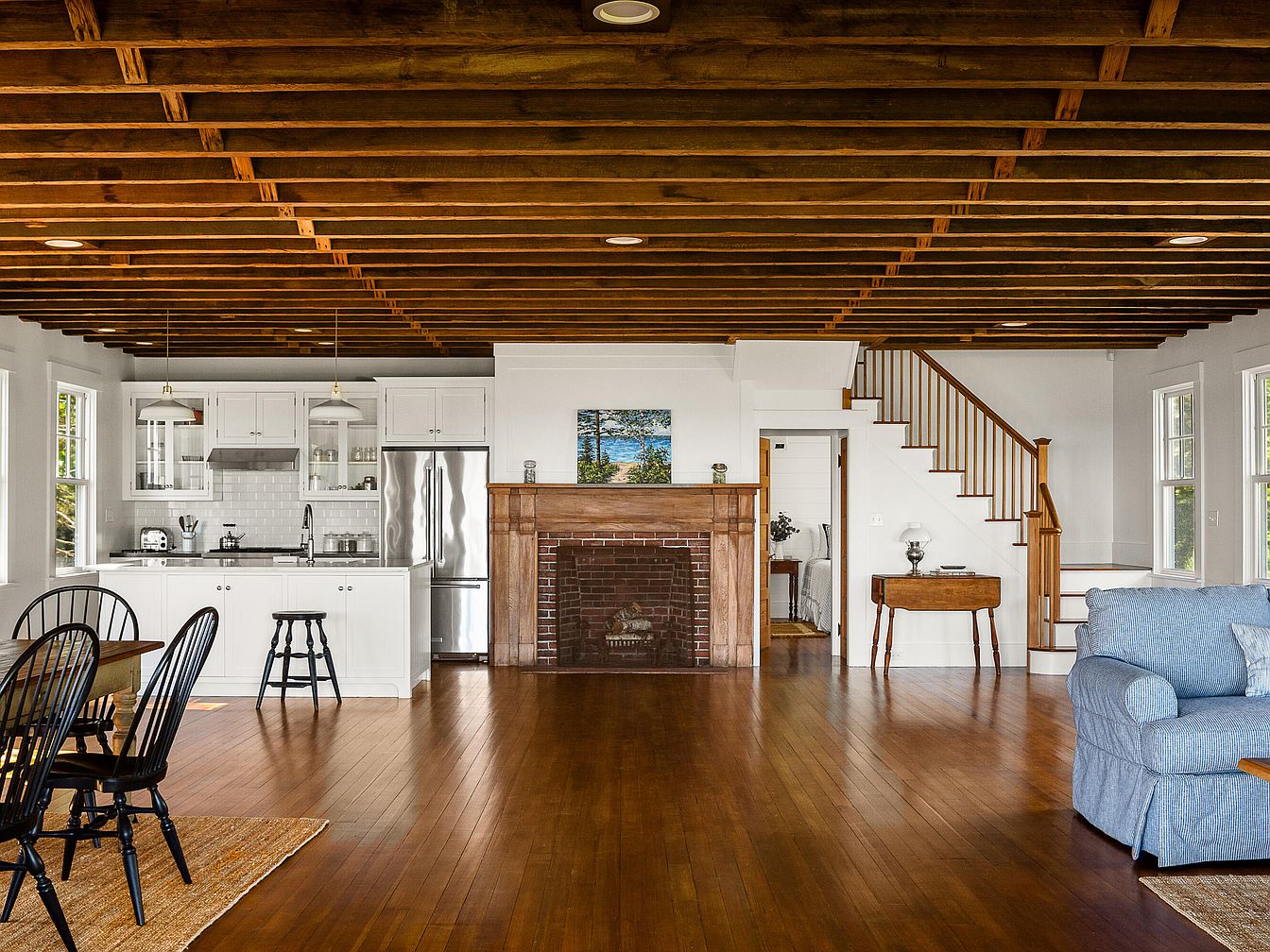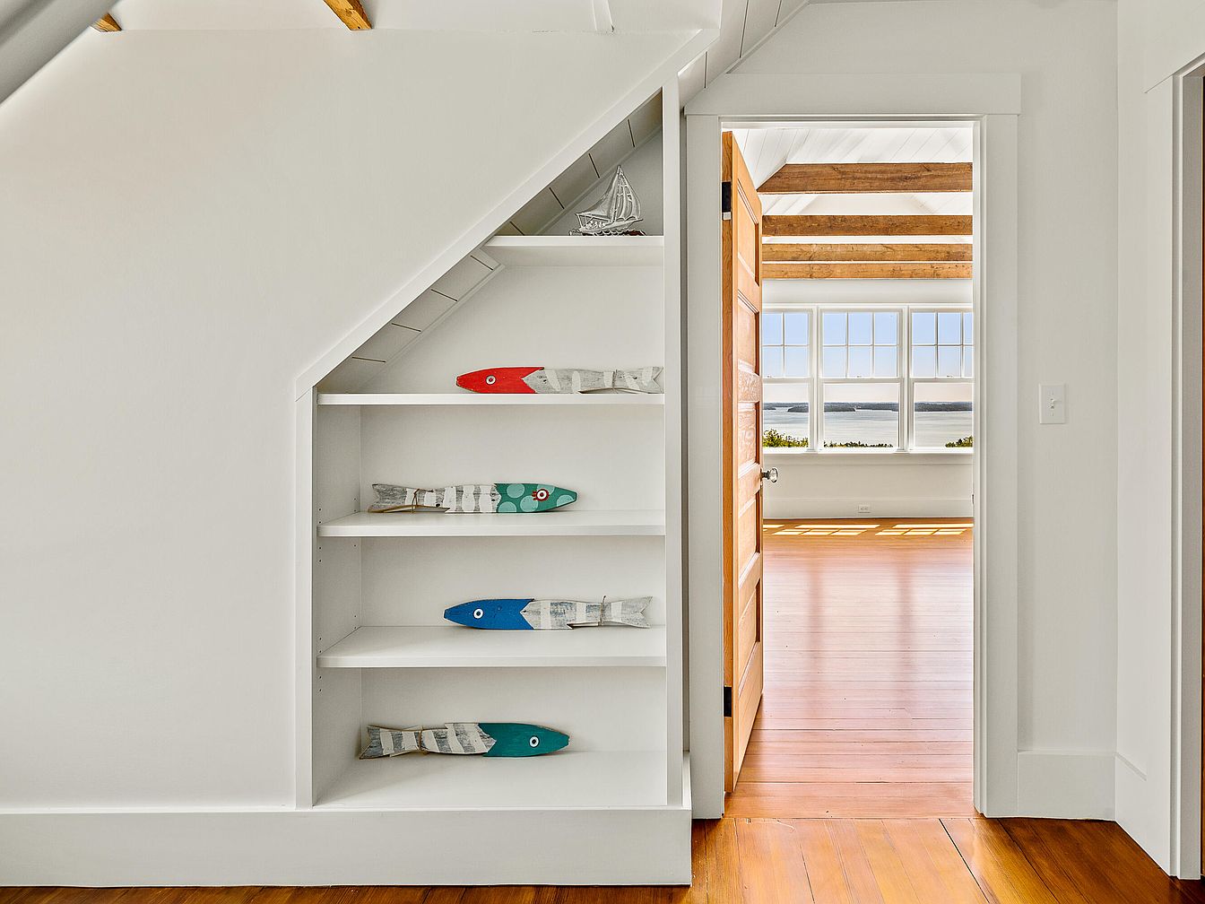 This entryway features a charming built-in shelf under the staircase, showcasing decorative wooden fish in bright colors such as red, blue, and green, adding a playful nautical touch. The walls are painted a crisp white, enhancing the airy feel of the space. The visible doorway leads to a spacious room with large windows, filling the corridor with natural light and offering a view of the serene outdoors. Exposed wooden beams run along the ceiling, contributing warmth and character. The hardwood floor adds a rich contrast, blending traditional and contemporary aesthetics harmoniously.