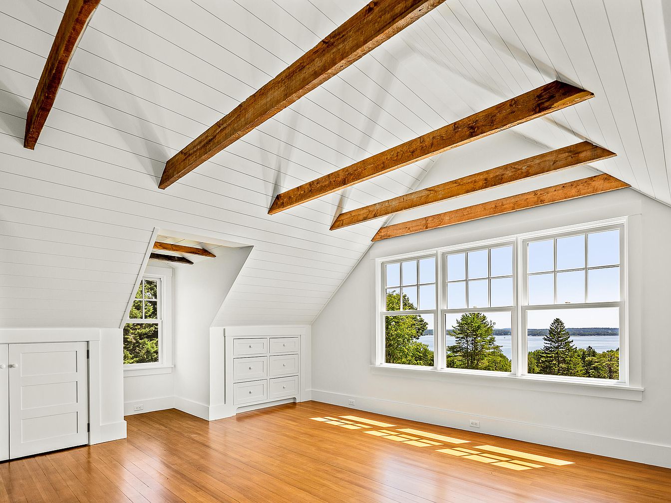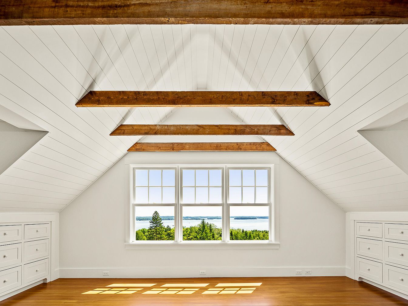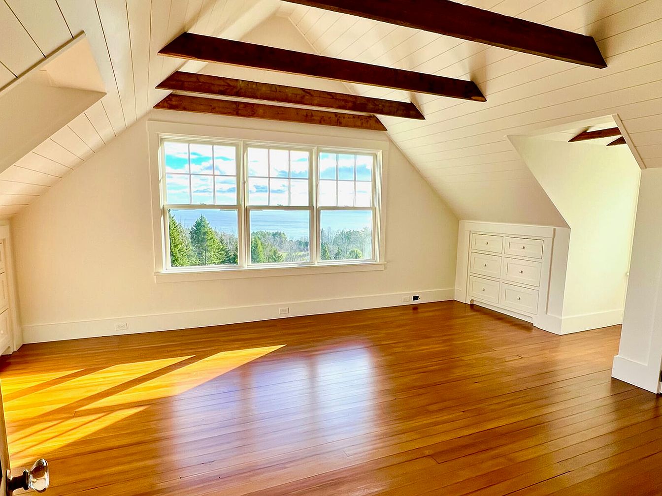An inviting attic space features a vaulted ceiling adorned with exposed wooden beams, showcasing a rustic charm. The walls are clad in crisp white wood paneling, enhancing the brightness and openness of the room. Natural light floods in through large, multi-pane windows, offering a panoramic view of the surrounding greenery and lake. The warm-toned hardwood floor adds warmth, complementing the bright aesthetic. A built-in white dresser and storage area blend seamlessly, maximizing functionality while maintaining a clean look. The overall design promotes a serene ambiance, perfect for relaxation or creative endeavors in this airy, peaceful retreat.