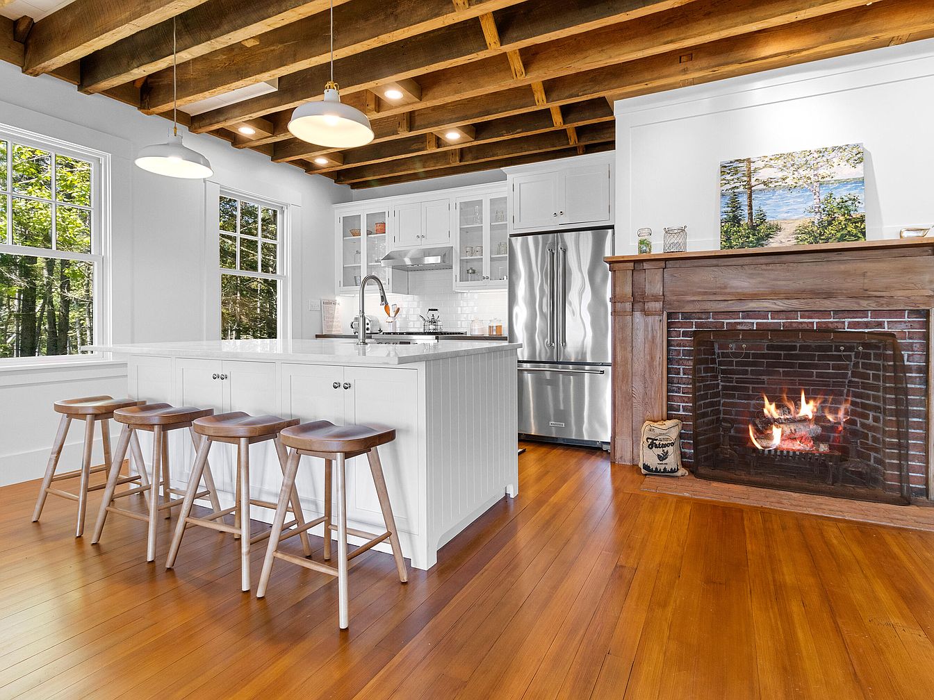 This kitchen emphasizes an open layout with a central island surrounded by four wooden stools. The island boasts a white countertop that contrasts with the warm, polished wood flooring. Above, two pendant lights with white shades hang from a natural wood ceiling, showcasing exposed beams. The cabinetry is sleek and white, complemented by stainless steel appliances, including a fridge with a gleaming finish. A cozy fireplace made of brick is nestled in one corner, adding warmth, with an art piece featuring a serene landscape above it. Large windows allow natural light to flood the space, enhancing its inviting ambiance.