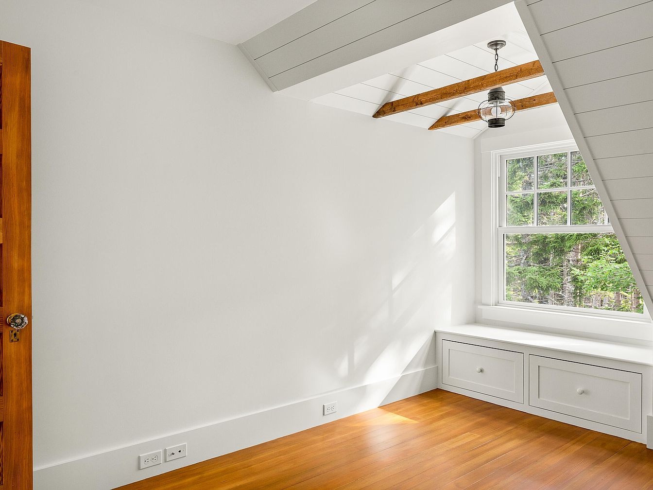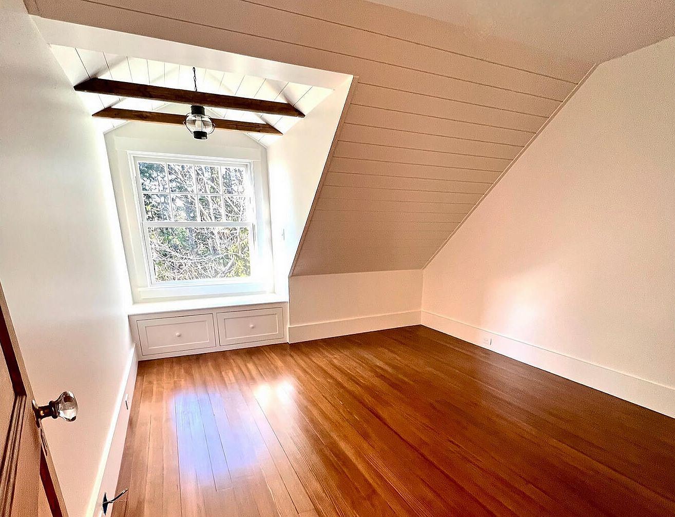 The space features a sloped ceiling, typical of an attic, with clean, white shiplap paneling that enhances the airy feel. A large, double-hung window invites natural light, framed by a built-in bench seat that provides extra storage. The polished hardwood floor adds warmth and richness to the room, complementing the soft, neutral wall tones. A rustic wooden beam supports a stylish light fixture, combining modern and traditional elements. Simple trim along the baseboard and window maintains the uncluttered aesthetic. This inviting room is perfect for a cozy retreat while showcasing charming architectural details.