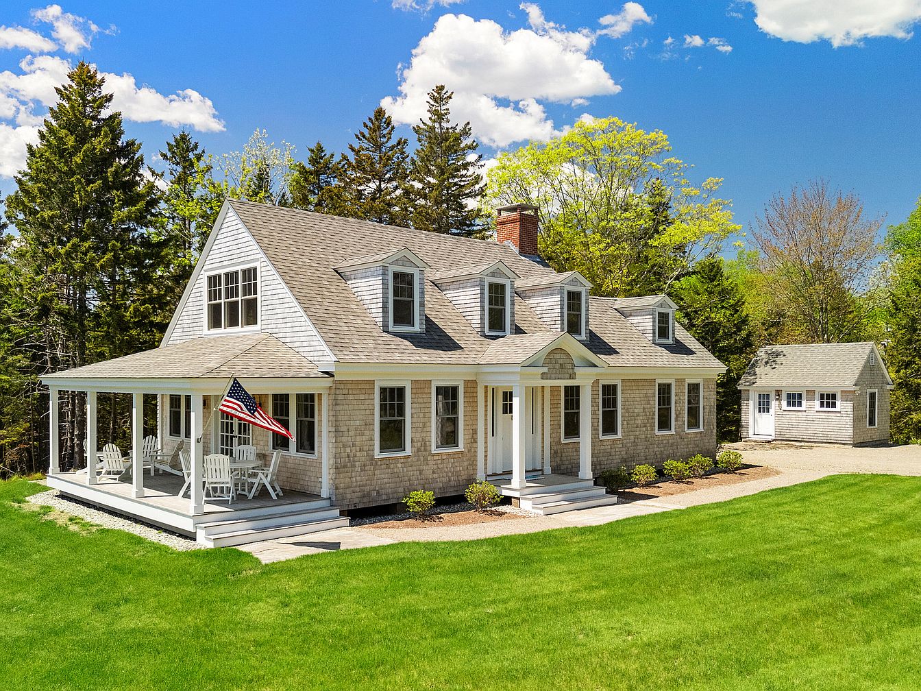 A charming historic home showcases a large front porch framed by white railings, offering inviting seating. The house features a shingled facade with shades of muted gray, complemented by a distinctive steeply pitched roof and dormer windows. Lush greenery surrounds the property, with vibrant trees at the rear enhancing privacy. A well-manicured lawn with rolling contours invites outdoor relaxation. The American flag hangs proudly from the porch, adding a patriotic touch. Architectural details, such as the brick chimney and symmetrical windows, enhance the home’s classic aesthetic, creating a warm and welcoming atmosphere against a clear blue sky.