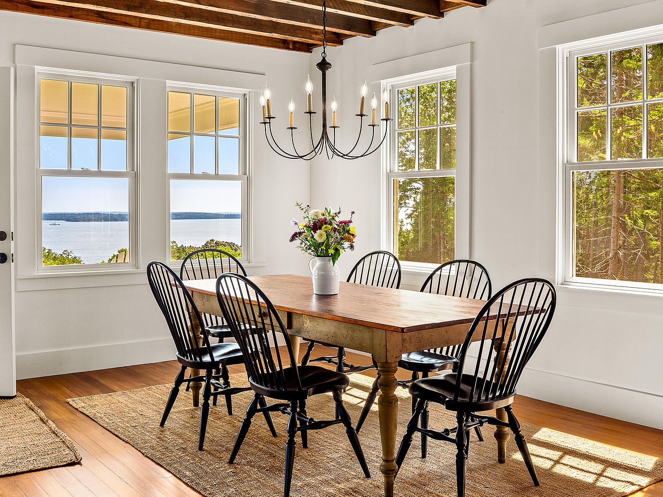 A bright dining area features a long, rustic wooden table surrounded by six black spindle-back chairs. The warm wooden flooring complements the simple natural textures, while a large woven rug adds coziness beneath. Two large windows frame picturesque views of a water landscape, allowing ample natural light to stream in. Above the table, a wrought iron chandelier with candle-like bulbs hangs, enhancing the rustic charm. The walls are painted white, maximizing the open and airy feel, and exposed wooden beams on the ceiling lend an additional touch of character. A vase filled with colorful flowers completes the inviting atmosphere.