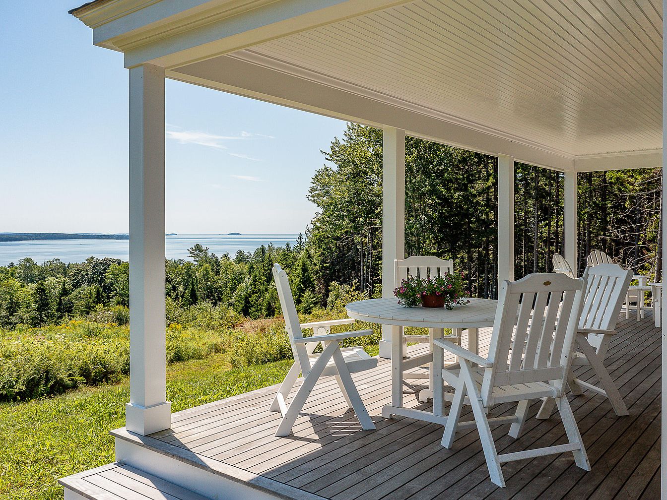 A spacious outdoor patio features a white wooden table surrounded by matching chairs, inviting relaxation. The setting boasts a stunning view of a serene lake, framed by lush greenery. The vertical wooden beams supporting the porch create a sense of openness, while the slatted ceiling adds architectural interest. Sunlight filters through, illuminating the natural wood floor. A potted plant with vibrant flowers sits at the center of the table, adding a pop of color. The harmonious blend of nature, wooden textures, and white furnishings complements the tranquil ambiance, creating an ideal space for outdoor gatherings or solitary moments.