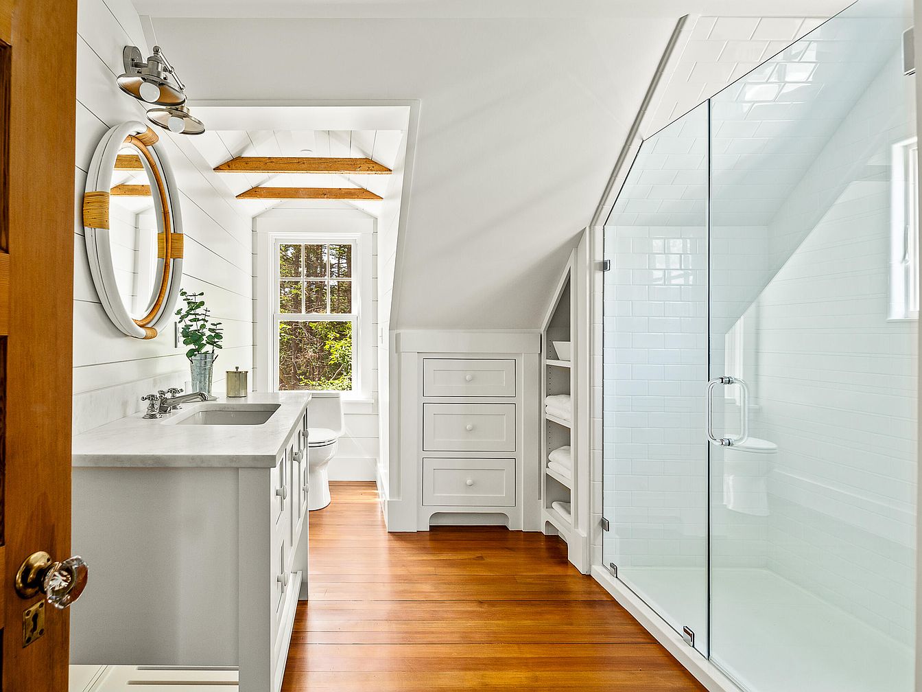 This bathroom features a bright, airy layout highlighted by sloped ceilings with exposed wooden beams. The walls are adorned with white shiplap, enhancing the fresh, coastal ambiance. A sleek marble countertop houses double sinks, complemented by elegant chrome fixtures. Natural light floods through a window, illuminating a round mirror framed in wood, adding a warm touch. In the corner, a glass-enclosed shower showcases white subway tiles, creating a clean and modern look. The light wood flooring adds warmth, while neatly stacked towels in a white cabinet maintain a sense of order and tranquility, completing this serene retreat.