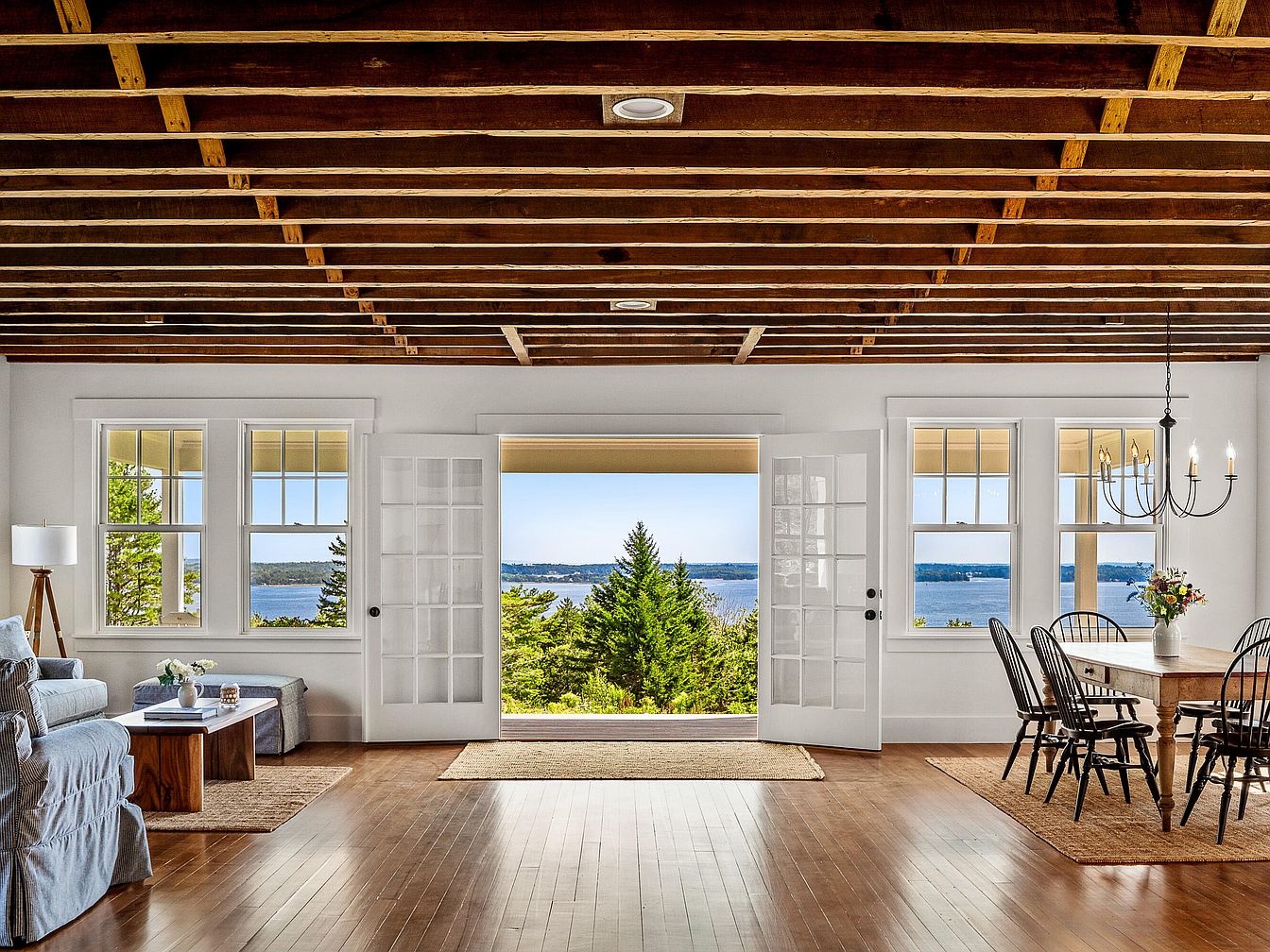A spacious open concept area blends seamlessly with nature through large double doors showcasing a stunning waterfront view. The room features warm wooden beams on the ceiling, contributing to a rustic charm. Light-colored walls and polished hardwood floors create a bright, inviting atmosphere. A comfortable, blue striped sofa faces a simple wooden coffee table, while a complementary area rug adds texture. On the dining side, a wooden table and black spindle chairs invite gatherings. Natural light floods the space, enhanced by elegant light fixtures, with greenery framing the picturesque landscape visible through expansive windows.