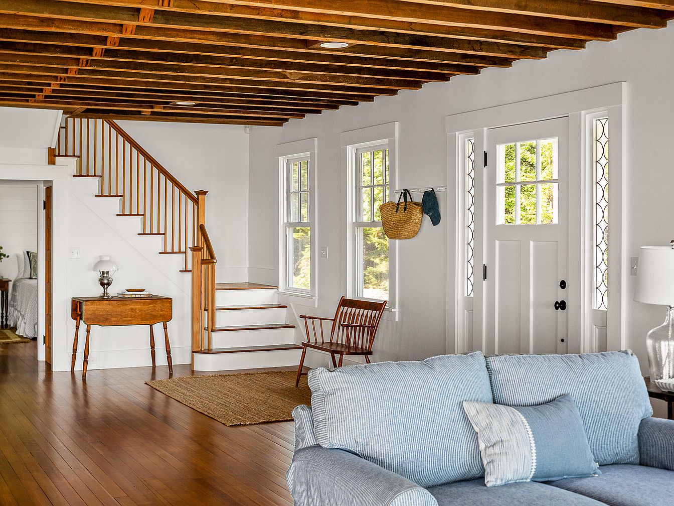 This spacious entryway features a blend of traditional and modern design elements. Light-colored wooden flooring enhances the welcoming atmosphere, while exposed wooden beams add character and warmth. A winding staircase, with a polished wooden banister, leads to the upper floor. Natural light floods in through multiple windows, framed by white trim, creating an airy feel. A rustic side table complements the space, adorned with a vintage lamp and decorative items. A woven basket hangs by the door, exuding casual charm. A cozy, blue-striped sofa invites relaxation, completing the inviting aesthetic of this well-designed entry.