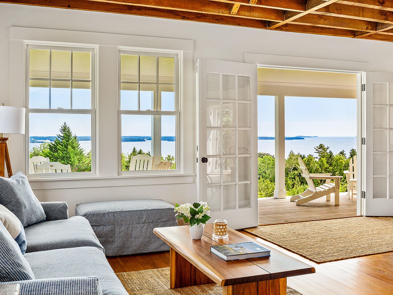This living room features a spacious, airy layout optimized for views of the serene landscape beyond. Large double-hung windows frame the picturesque scenery, offering glimpses of lush greenery and the glistening water. A gray sectional sofa, accented with striped cushions, provides comfort, while a wooden coffee table with a clean finish adds a touch of warmth. A textured area rug in neutral tones grounds the space, inviting relaxation. The ceiling displays exposed wooden beams, enhancing the rustic charm. Light cascades in, creating a bright atmosphere that harmonizes indoor elegance with the tranquility of outdoor living.
