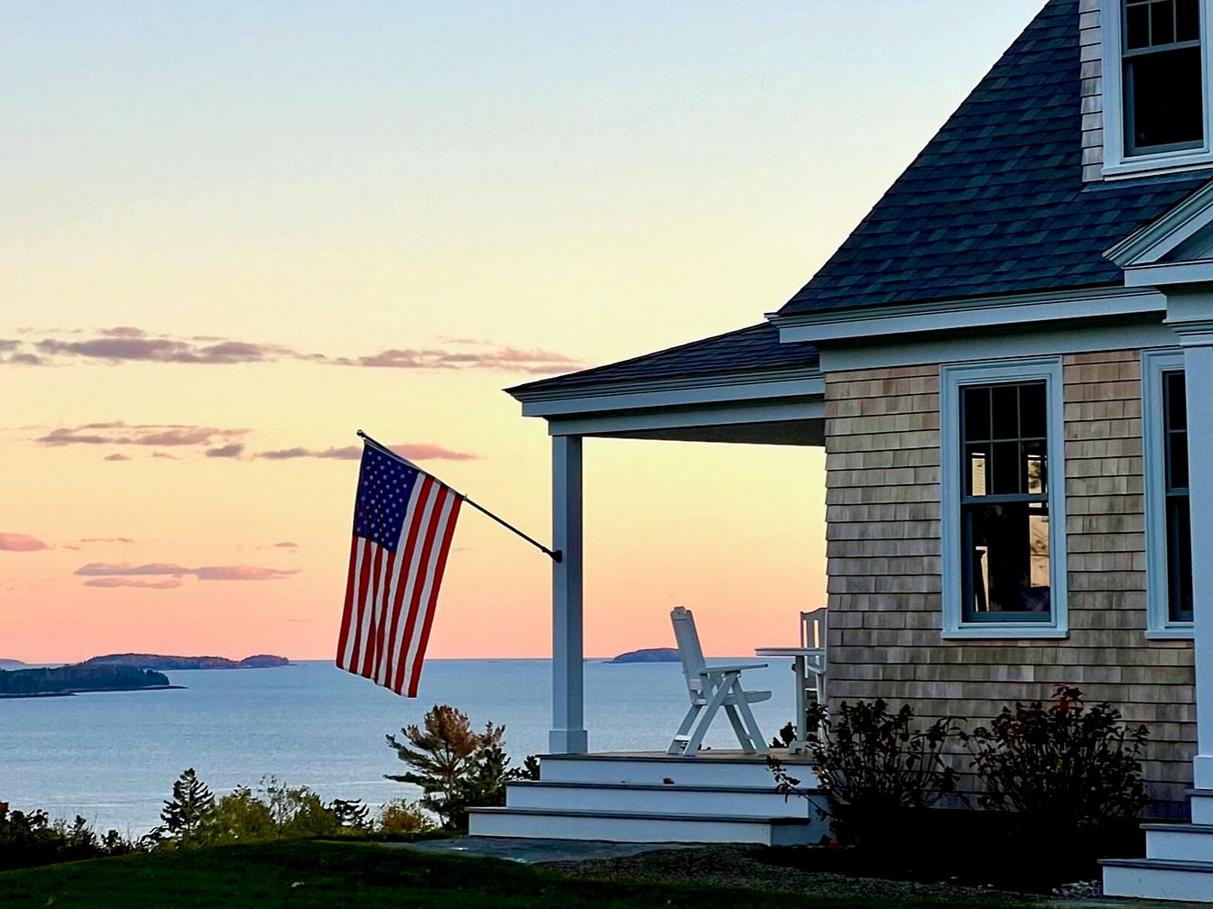 The front porch features a classic American aesthetic, showcasing a wooden structure with a shingled exterior in natural tones. An American flag flutters proudly, adding a patriotic touch. Adjacent to the porch is a simple white adirondack chair that invites relaxation and offers stunning views of a calm sea at sunset. The color palette transitions from soft blues in the sky to warm peach and lavender hues, creating a serene atmosphere. A few manicured shrubs frame the porch, enhancing the inviting feel. Architectural details include clean lines, a gabled roof, and white trim that highlight the home’s charm.
