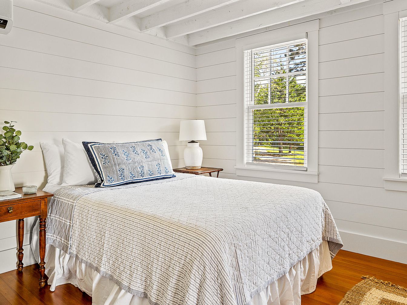 The bedroom features a cozy and inviting atmosphere with a serene color palette. Light, shiplap walls enhance the brightness, complemented by a wooden floor that adds warmth. A neatly made bed is dressed in soft, textured linens with a detailed throw pillow highlighting blue and white patterns. Two windows allow natural light to flood the space, while elegant blinds maintain privacy. A simple wooden bedside table holds a modern lamp and a small potted plant, enhancing the room’s tranquility. The exposed beams on the ceiling add a rustic touch, creating a harmonious blend of modern comfort and classic charm.
