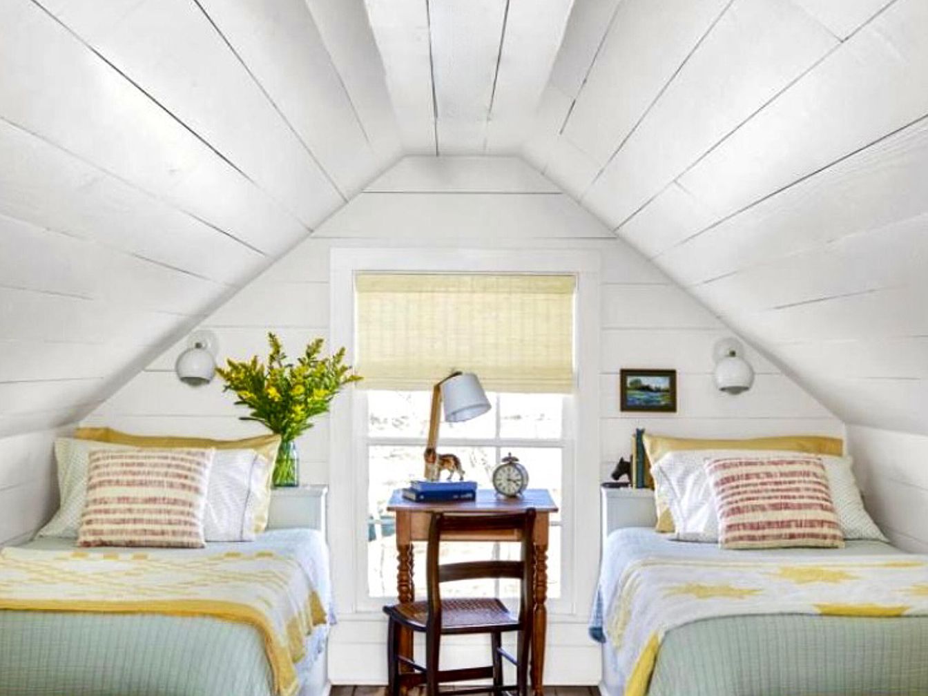 A cozy attic bedroom with a charming sloped ceiling painted white, accented by wooden panels. Two twin beds, adorned with pastel-colored quilts—one featuring a subtle yellow and another a soft green. Each bed has decorative pillows, adding charm. A small bedside table exhibits a vibrant vase filled with fresh flowers. Natural light streams through a window adorned with a bamboo shade, complementing the warm tones. A wooden desk sits between the beds, featuring a lamp, an antique clock, and books, inviting reading or study. Simple yet elegant artwork hangs on the walls, enhancing the room’s warmth and personality.