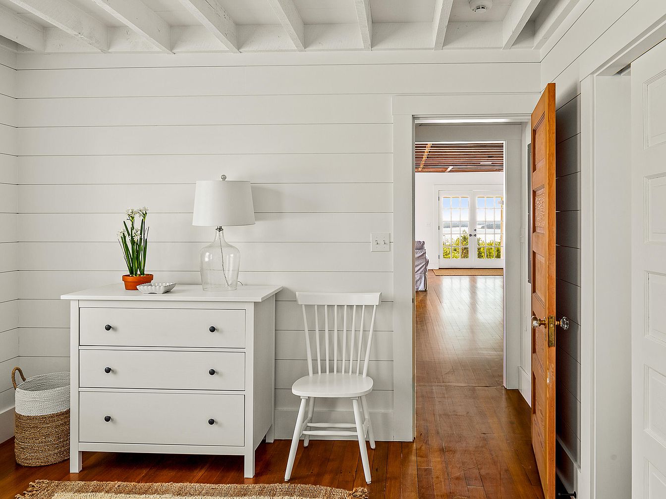 A bright entrance hallway features white shiplap walls that create a fresh, airy atmosphere. To the left, a modern white dresser with three drawers showcases minimalist black knobs, topped with a clear glass lamp and a small potted plant. A round dish rests beside them, adding a decorative touch. Adjacent, a simple white chair complements the dresser. The wood floor contrasts in warm tones, enhancing the natural light flooding through the doorway at the end, which opens to a spacious room with views outside. An inviting wooden door leads further into the home, framed by neatly white-painted trim.