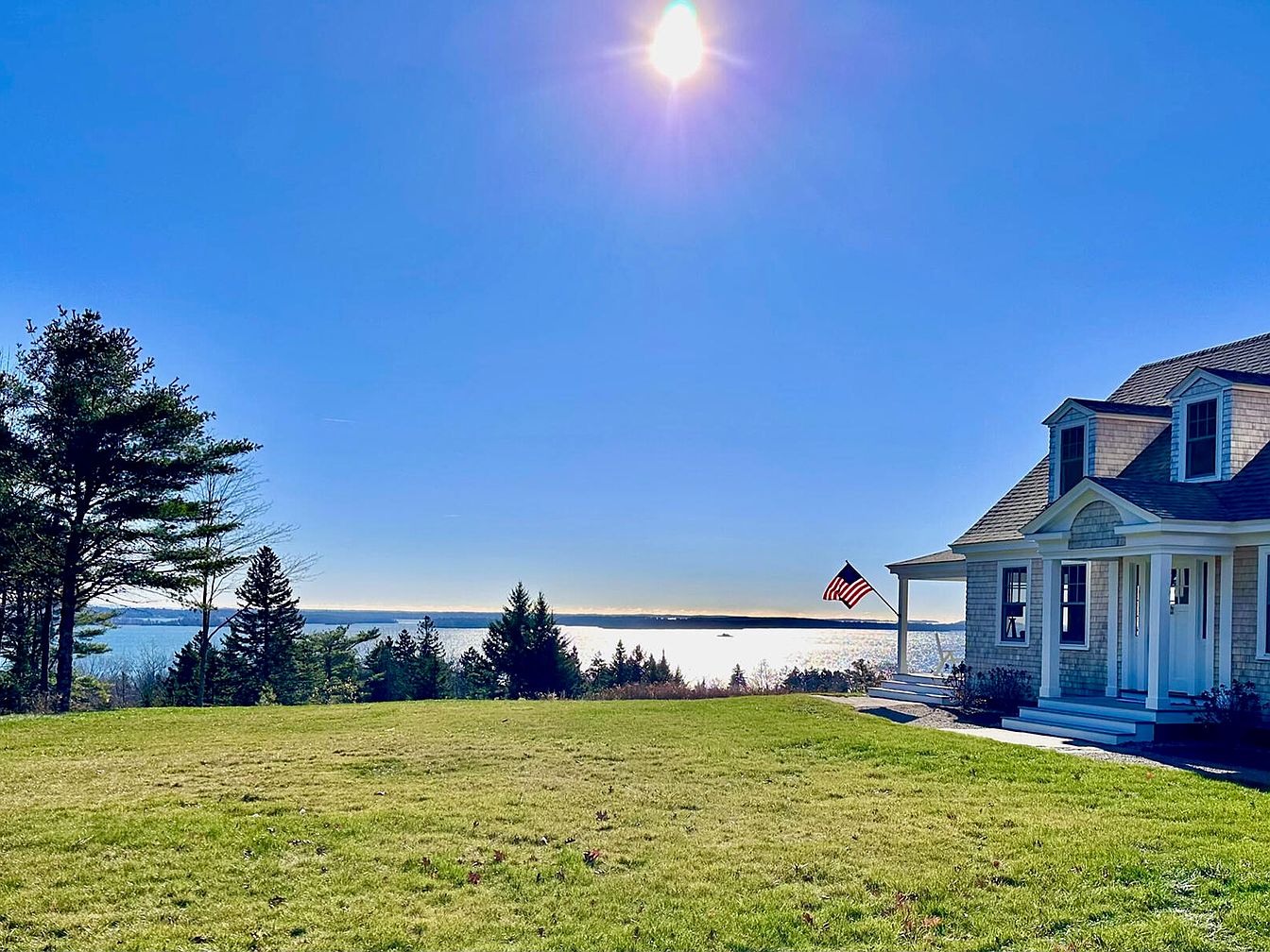 This image showcases the exterior of a charming historic home set against a stunning landscape. A spacious, manicured lawn stretches out to the foreground, bordered by an array of vibrant green trees that provide a natural backdrop. The house, featuring classic shingle siding and a steeply pitched roof, offers a welcoming porch with white railings, emphasizing a cozy aesthetic. The front door is flanked by windows, allowing ample natural light. In the distance, shimmering waters stretch toward the horizon beneath a bright blue sky, while the sun casts a warm glow, enhancing the serene atmosphere.