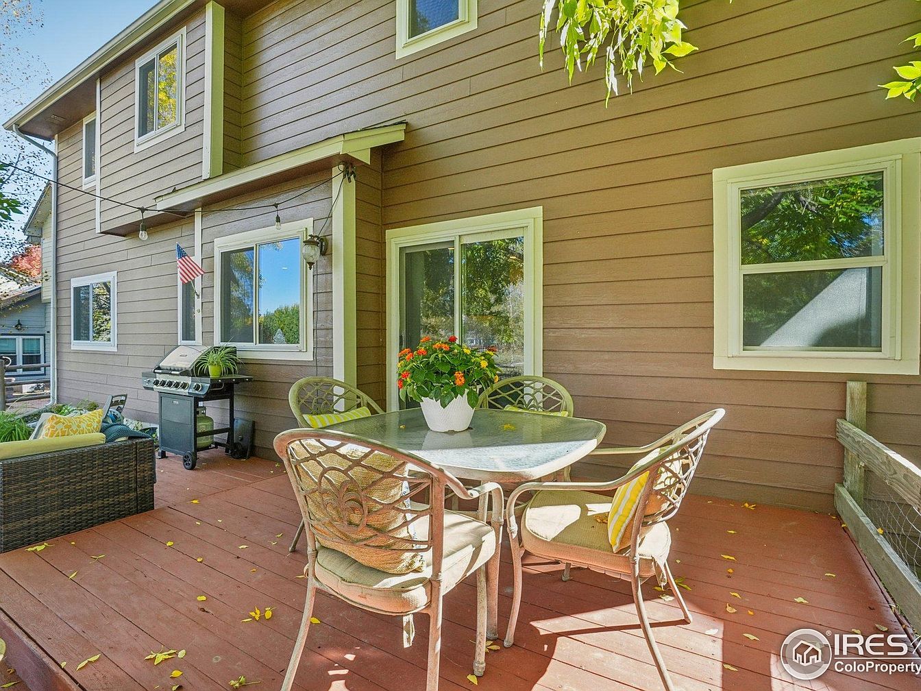 An inviting outdoor deck features a circular glass table surrounded by metal chairs, ideal for gatherings. The deck’s wooden flooring, tinged with autumn leaves, complements the home’s earthy brown siding. A gas grill sits against the wall, perfect for barbecues. Vibrant potted flowers add pops of color, enhancing the natural aesthetics. Large windows provide a view of the green garden beyond, while a small American flag hangs near the entrance for a patriotic touch. Soft sunlight filters through the trees, creating a warm and welcoming ambiance, perfect for relaxing or entertaining guests outdoors.