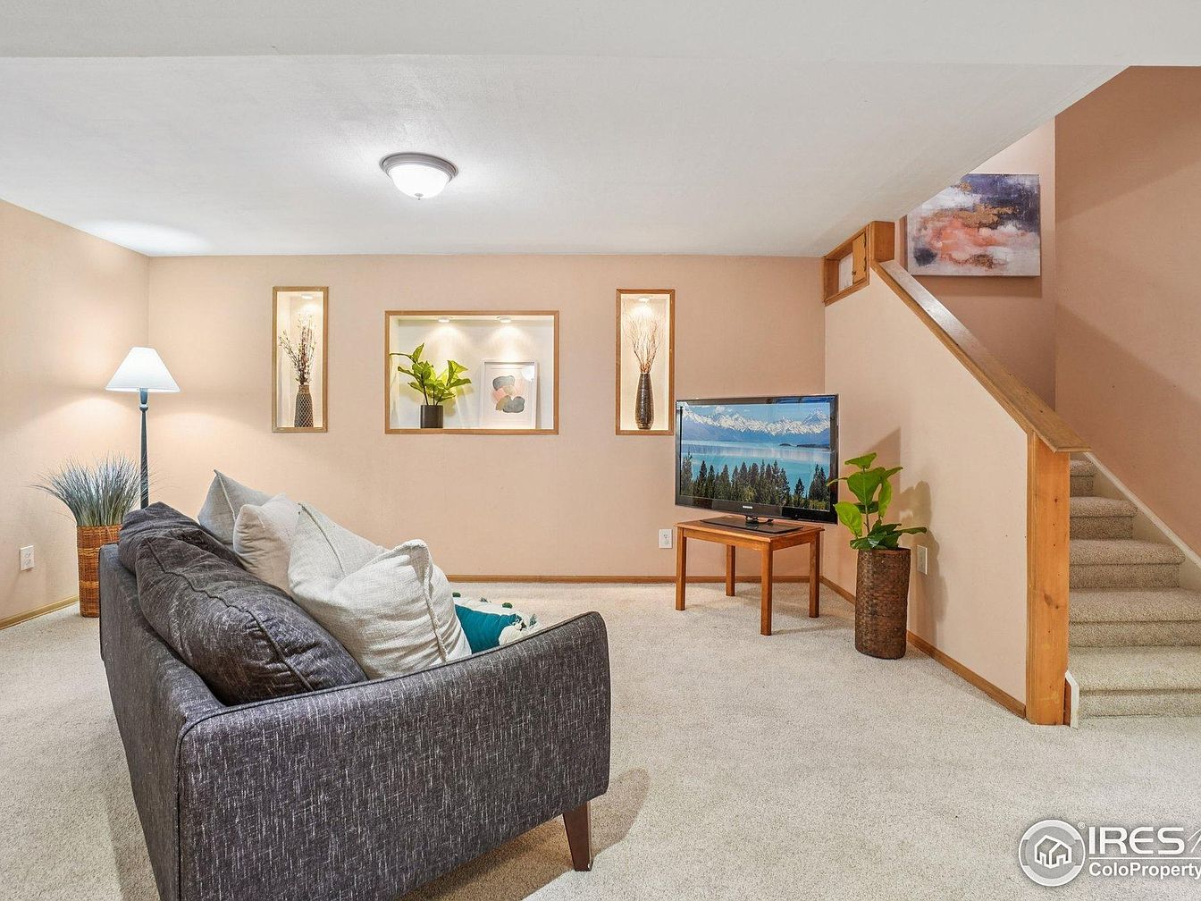 This cozy lower living room features a beige color palette, creating a warm and inviting atmosphere. A gray fabric sofa with assorted cushions sits prominently, paired with a simple wooden side table holding a television. Natural light enhances the space, illuminated by a floor lamp. Decorative wall niches display potted plants and artwork, adding aesthetic interest. A gentle beige carpet enhances comfort underfoot, while wooden elements like the staircase railing and floor trims bring warmth. The room embodies a blend of modern and rustic styles, making it a perfect retreat for relaxation and leisure.