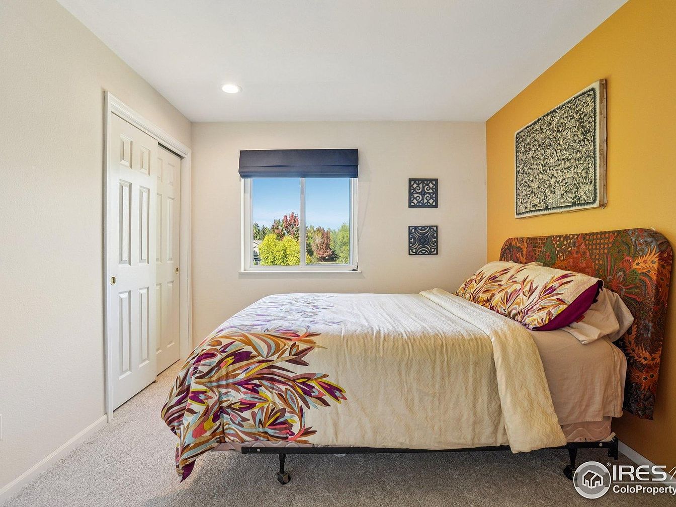 A cozy bedroom featuring a vibrant color scheme highlighted by a sunny yellow accent wall. The room has a comfortable bed adorned with a floral-patterned comforter in soft shades of pink, purple, and orange. A plush, light-colored carpet enhances the warmth of the space. To the left, double white doors provide access to storage, while the window invites natural light and showcases lush greenery outside. Above the bed, an intricately designed artwork hangs, complemented by two small decorative pieces on the adjacent wall. The overall aesthetic merges comfort with cheerful, modern touches.
