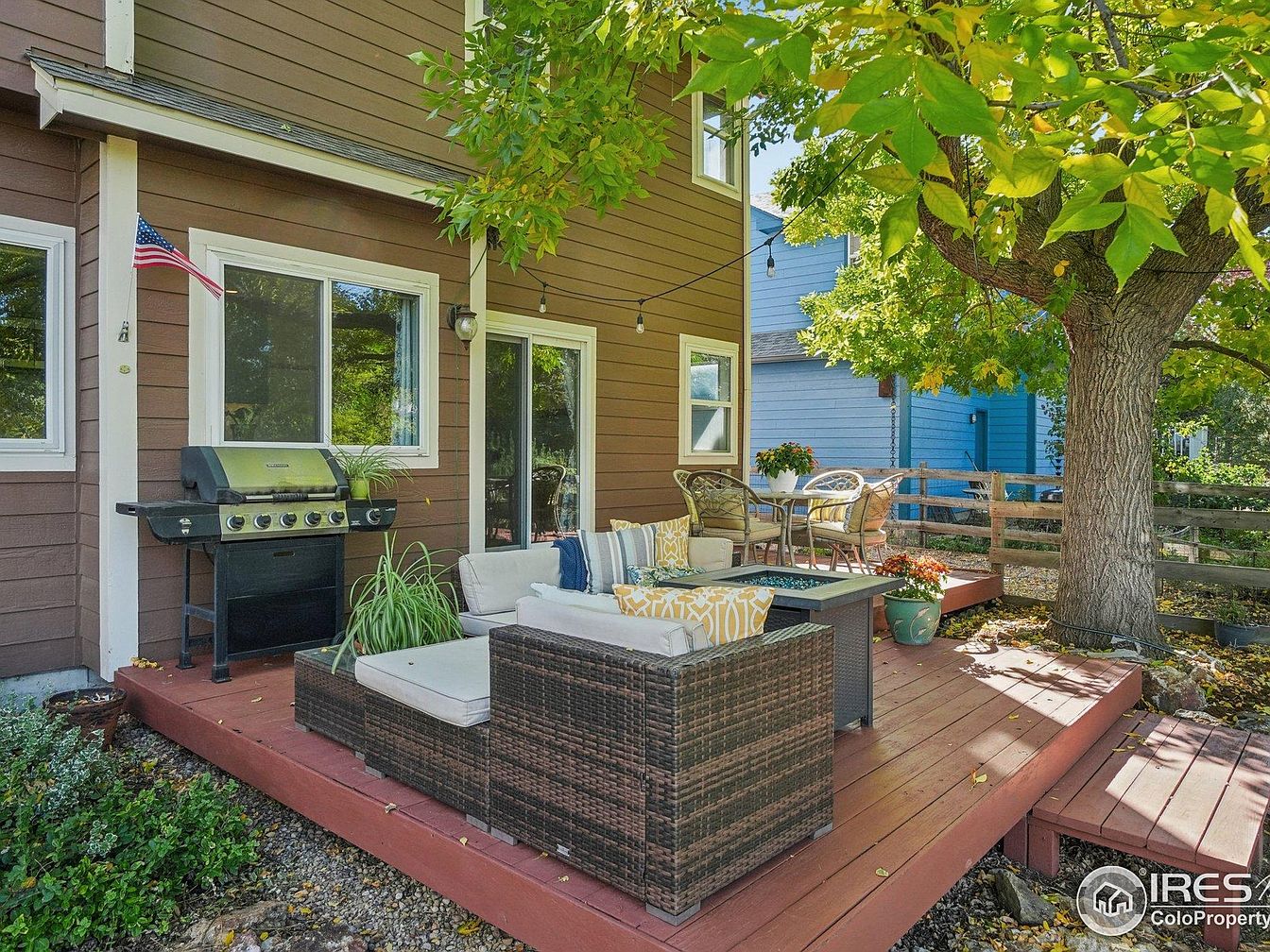 A charming patio space showcases a mix of comfort and functionality. A brown wooden deck extends from the house, bordered by low-maintenance landscaping featuring lush greenery. A modern grill sits against the side wall, ready for outdoor cooking. Cozy seating, composed of a stylish sectional sofa with light-colored cushions and vibrant patterned accents, invites relaxation. Across, a small dining set with elegant wicker chairs offers an intimate gathering spot. The space is enhanced by a large tree providing shade and a welcoming atmosphere, framed by a backdrop of colorful home exteriors, creating a serene outdoor retreat.