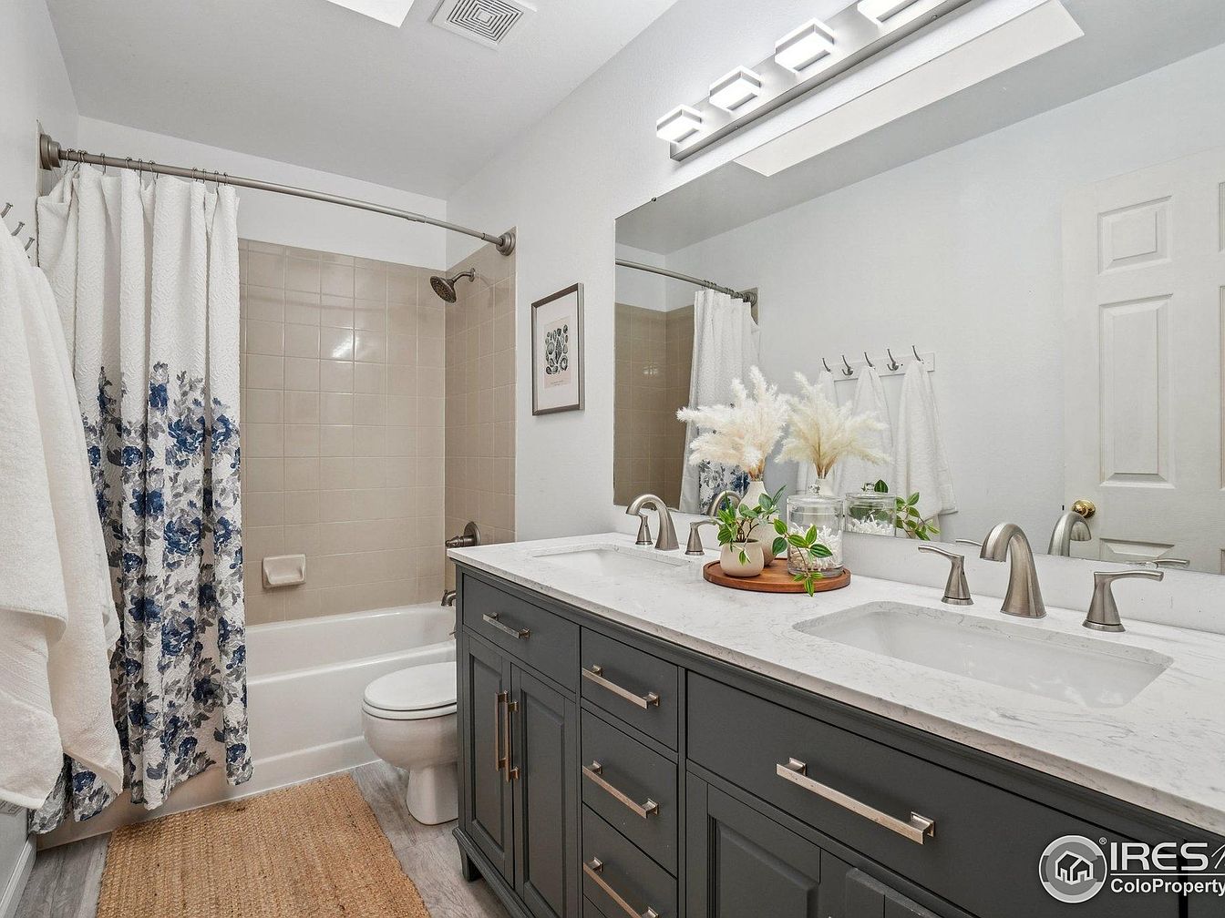 The bathroom features a modern design with a clean layout. A stylish dark gray vanity with sleek hardware sits beneath a spacious mirror. The dual sinks are complemented by a light-colored countertop that contrasts with the vanity’s dark tones. Nearby, a bathtub with a shower combination showcases a textured beige tile surround. A floral shower curtain, predominantly white with blue accents, adds a touch of color. Light and airy towels hang neatly on metal hooks, while a natural fiber rug enhances warmth underfoot. Bright overhead lighting illuminates the space, enhancing its fresh and inviting atmosphere.