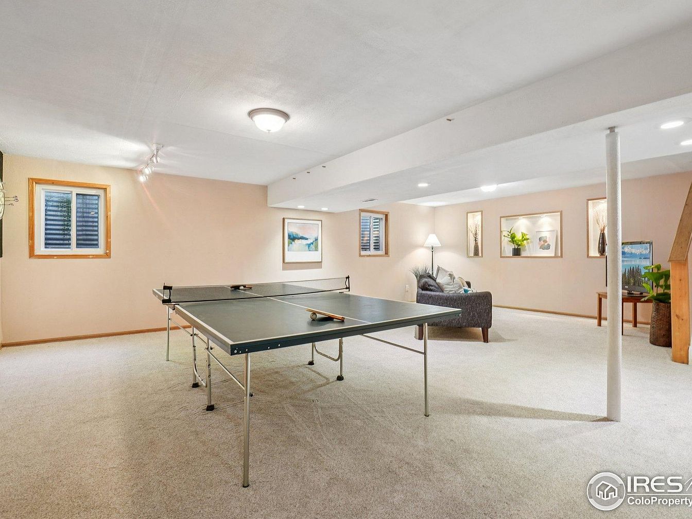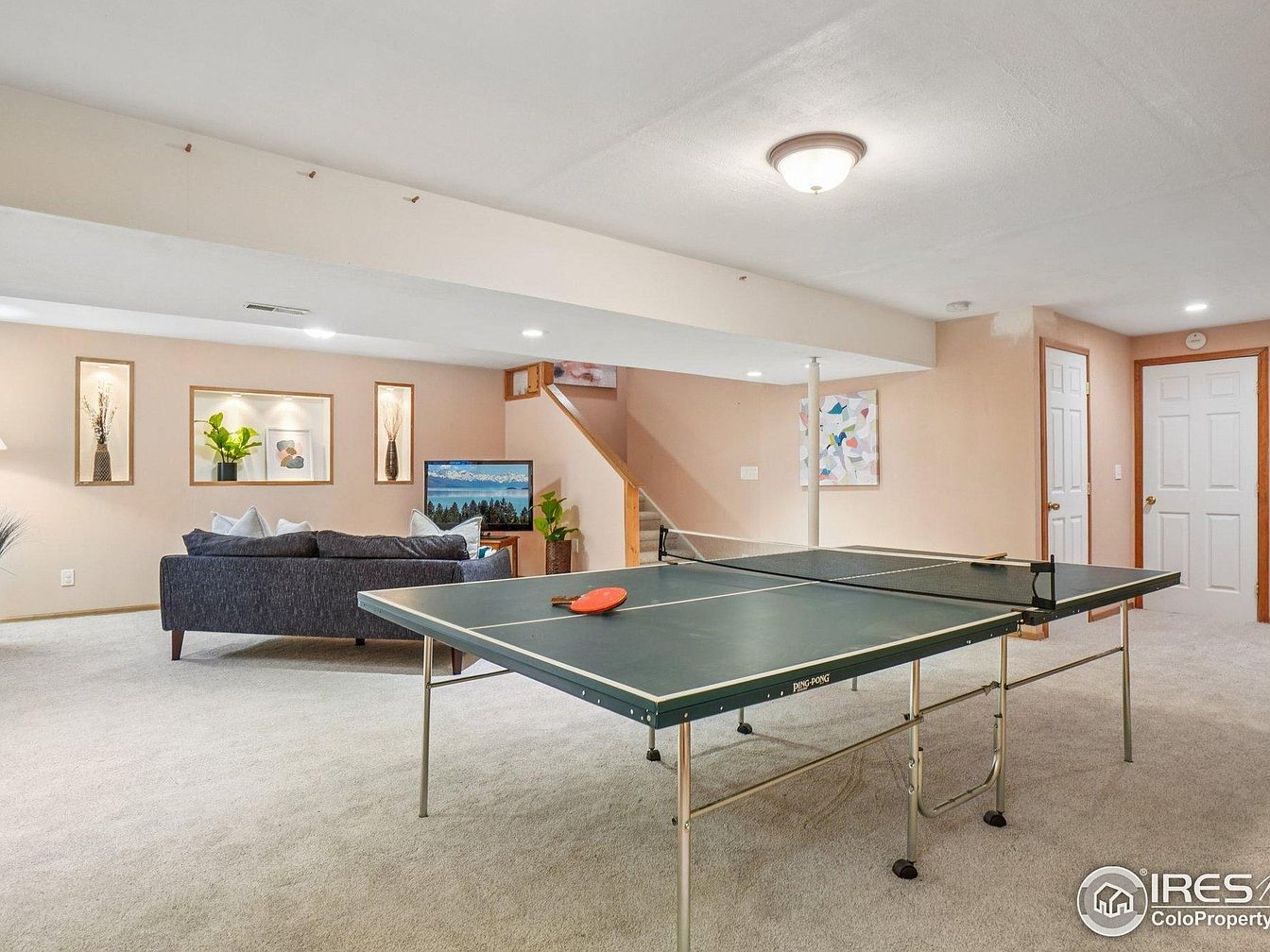 This basement game room is designed for leisure and entertainment, featuring a prominent ping pong table at its center. The walls are painted in soft beige, creating a cozy atmosphere. A dark-colored sofa with plush cushions offers seating, complemented by tasteful artwork displayed in frames on the walls. Warm lighting fixtures enhance the inviting feel, while plush carpeting underfoot adds comfort. A staircase in the background leads to the upper levels, hinting at the home’s spacious layout. A television is positioned nearby, making this area perfect for casual gatherings and recreational activities.