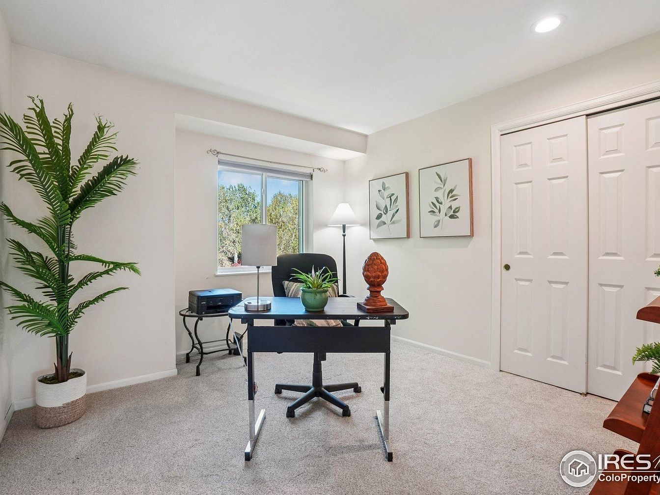 This cozy home office features a light, neutral color palette that enhances the sense of space. A sleek, modern black desk with clean lines is positioned centrally, paired with a comfortable chair. To the left, a lush, green potted plant adds a touch of nature and warmth. The soft carpet underfoot provides comfort, while a decorative lamp illuminates the area. Two framed botanical prints hang on the wall, reinforcing the natural theme. A window allows natural light to flood in, offering a view of greenery outside. Storage is efficiently handled by a closet door on the right.