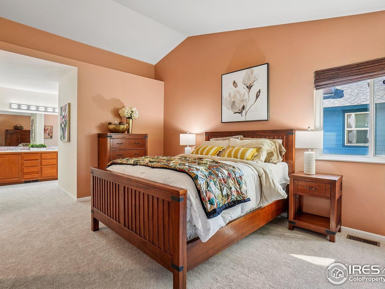 A cozy bedroom featuring a warm peach accent wall that enhances its inviting atmosphere. The bed, with a sturdy wooden frame, is adorned with a multi-colored quilt and bright striped pillows. Flanking the bed are modern bedside tables with stylish lamps, adding functionality and charm. The soft beige carpet complements the earthy tones while providing comfort. A large window brings in natural light, revealing a glimpse of blue siding outside. Visible in the background is a spacious vanity area with wooden cabinets and decorative artwork, suggesting practicality and a personal touch in this serene retreat.
