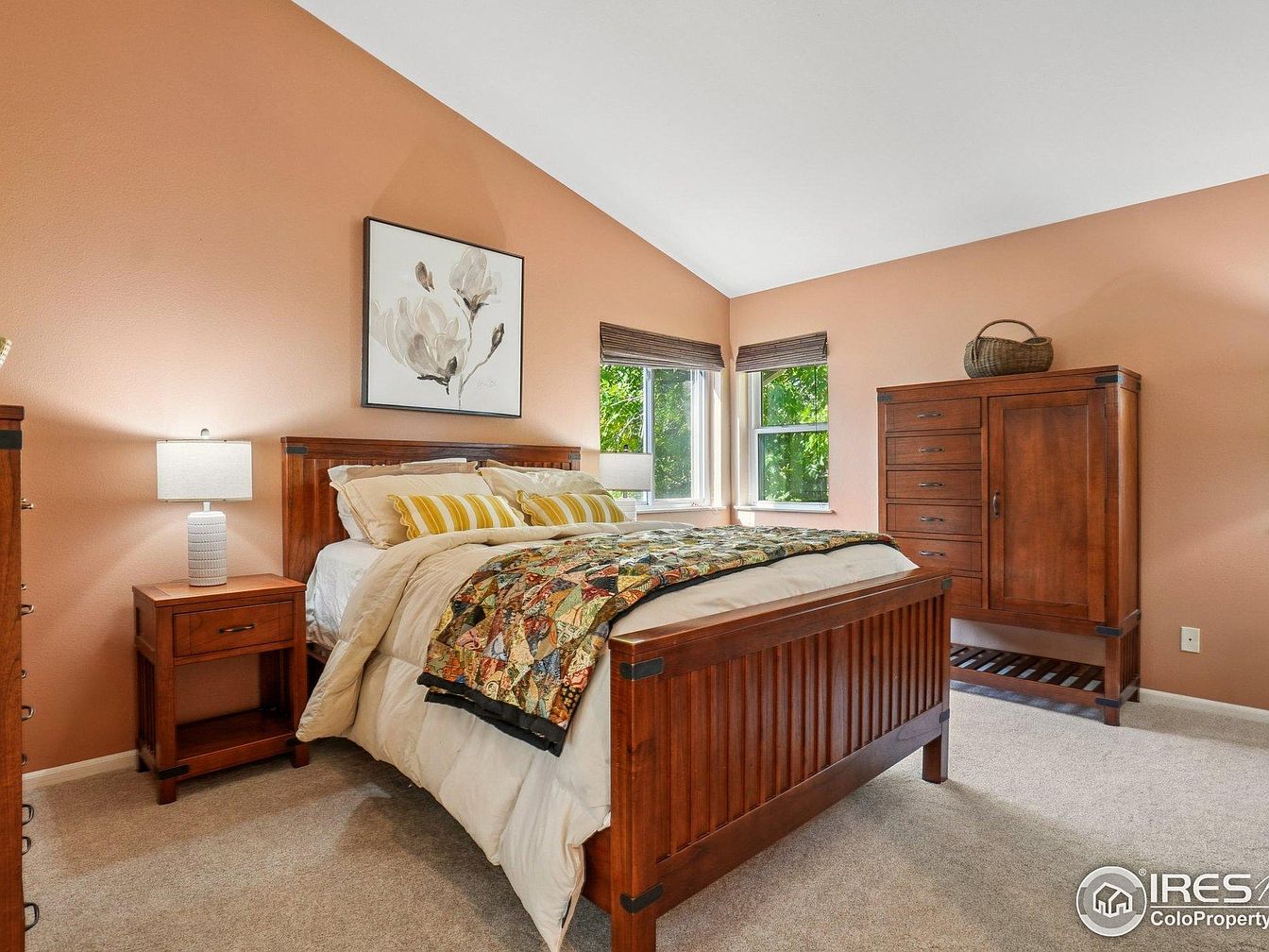 This spacious bedroom features a warm peach wall color, enhancing the cozy atmosphere. A king-sized wooden bed with a slatted headboard sits prominently in the center, adorned with fluffy white bedding and a colorful patchwork quilt. Flanking the bed are matching nightstands, each topped with stylish lamps for ambient lighting. A tall wooden armoire adds vertical interest, complementing the room’s rustic charm. Large windows with wooden blinds allow natural light to filter in, accentuating the room’s inviting feel. The neutral carpet ties the space together, creating a harmonious blend of comfort and elegance.
