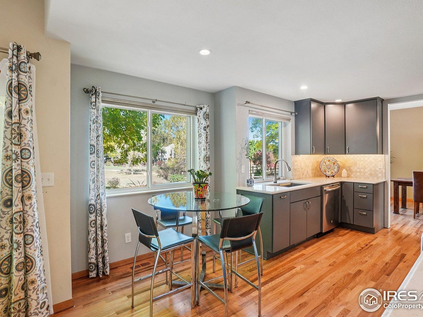 This cozy dining nook features a modern circular glass table surrounded by sleek metallic chairs. The backdrop includes a large window framed by elegant patterned curtains, letting in natural light and offering views of the vibrant outdoor greenery. The kitchen cabinets are a contemporary dark gray, contrasting tastefully with the warm wooden floor, which has a polished finish. A decorative backsplash in soft neutral tones enhances the countertop beneath a stylish faucet. The overall aesthetic combines modern simplicity with soft textures and colors, creating an inviting space for meals or casual gatherings.
