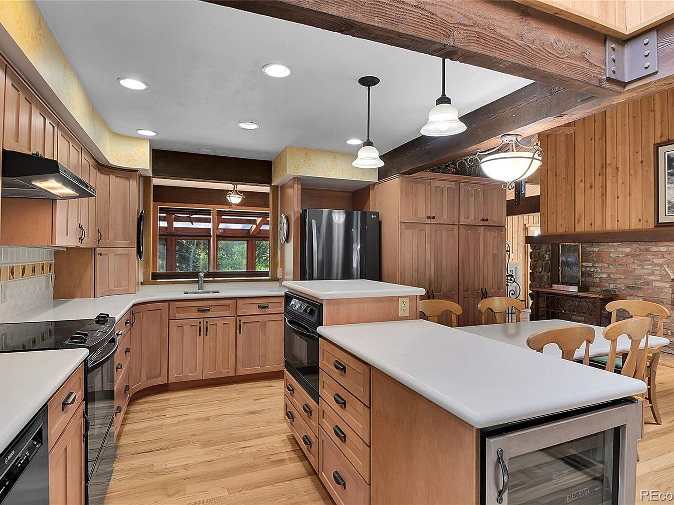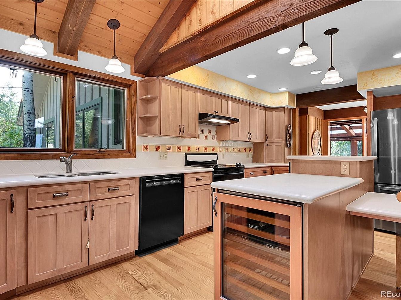 A spacious kitchen features warm, natural wood cabinetry and exposed ceiling beams, echoing a rustic yet inviting ambiance. Soft cream countertops complement the wood tones, extending to a central island with a built-in glass-front wine cooler. Black appliances, including a dishwasher and stove, provide contrast. Large windows framed in wood overlook greenery outside, allowing daylight to brighten the room. Pendant lights with frosted glass shades hang from the wood-paneled ceiling. Open shelving in corner cabinets adds visual interest. The open layout seamlessly connects to adjacent rooms, highlighted by the continuity of wood floors and trim throughout.