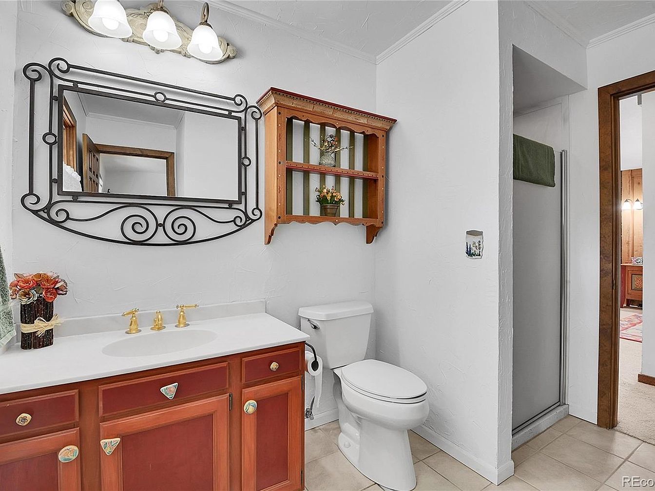 A spacious bathroom featuring a white countertop vanity with deep reddish wood cabinetry accented by colorful knob handles. Above the vanity, a large decorative mirror with an ornate black wrought iron frame hangs beneath three elegant wall-mounted lights. The walls are textured and painted white, while the floor is finished with light beige tiles. To the right, a white toilet is positioned below a rustic wall-mounted wood shelf with cut glass doors and small decorative items. An open doorway reveals a tiled walk-in shower bordered by white trim, and a warm wood-trimmed doorway leads into an adjacent, softly lit room.