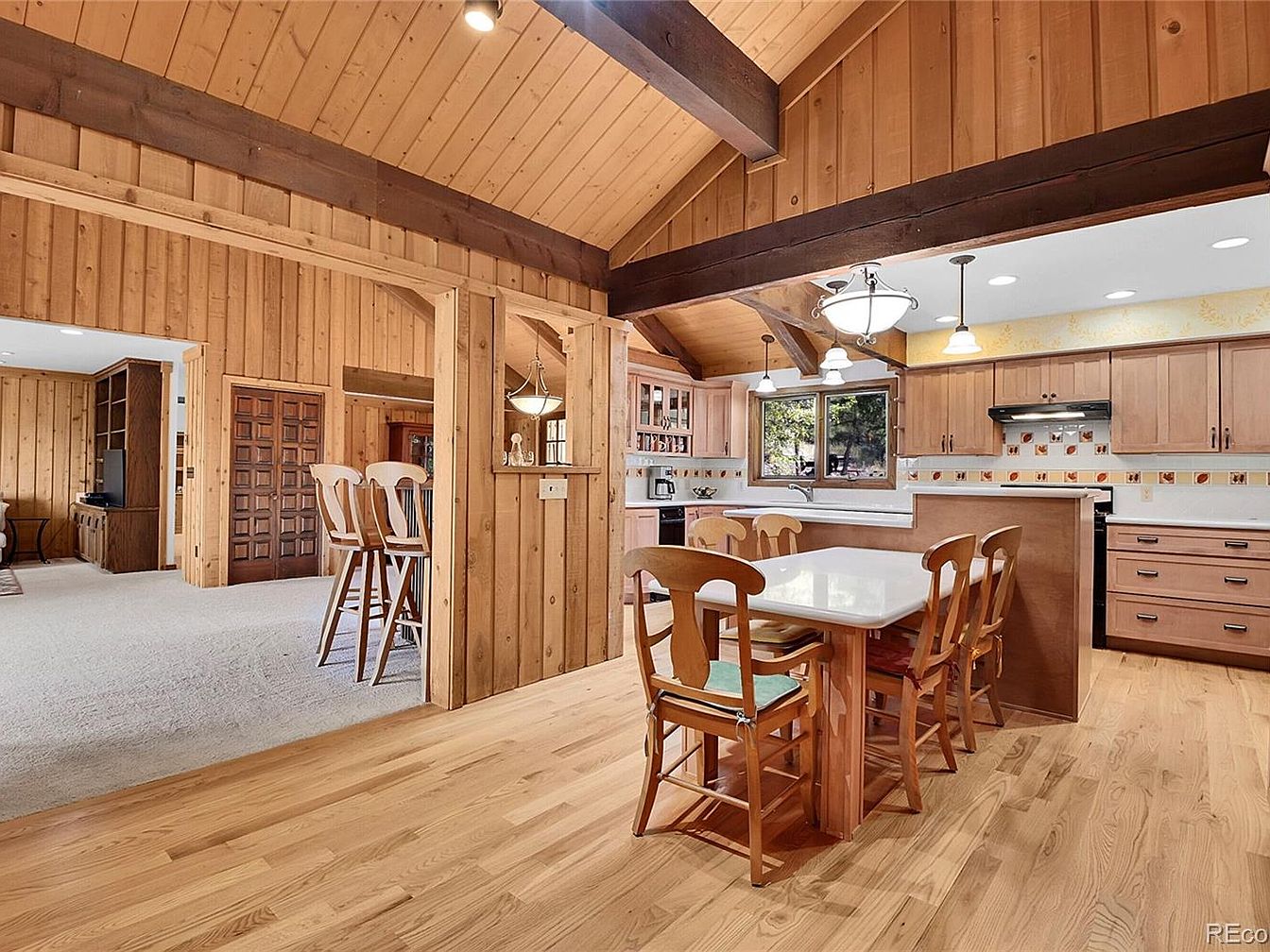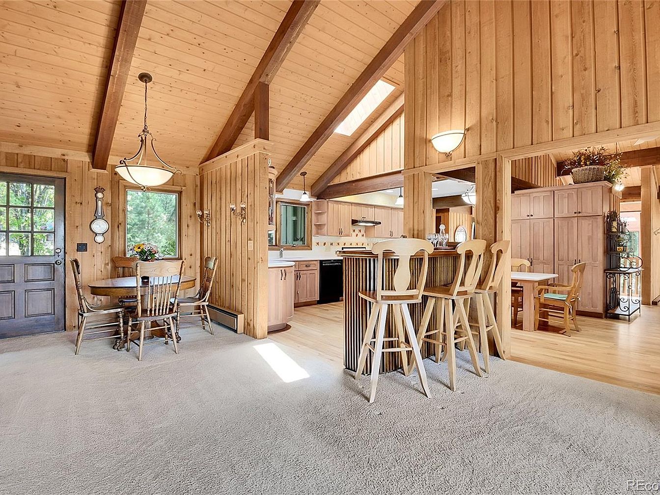 A warm, inviting kitchen and dining area unified by natural wood paneling on both walls and ceilings, with exposed beams drawing the eye upward. The open plan includes a cozy round wooden dining table and chairs near a multi-paneled wood door, adjacent to a window that lets in natural light. The kitchen boasts a central island with light wooden bar stools, accented by pendant and wall lighting. Sturdy cabinets and abundant countertop surfaces create a functional feel, while soft-toned carpeting flows into light hardwood flooring, blending comfort and rustic charm throughout the space.