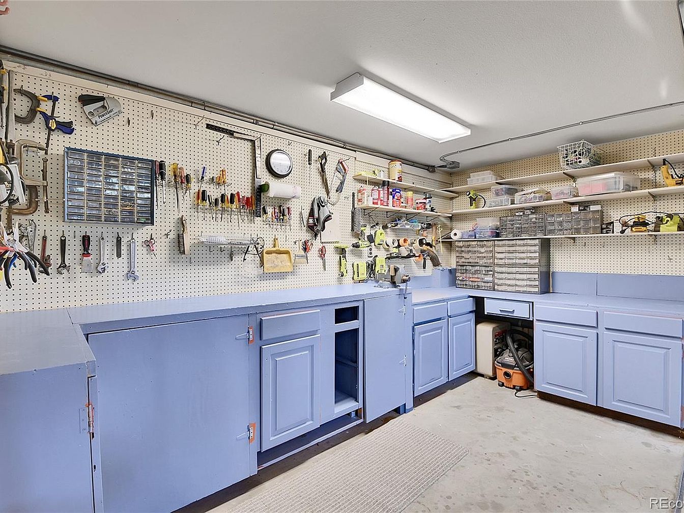 A spacious workshop features a U-shaped configuration of light blue cabinetry with ample countertop workspace. Above the work surfaces, the walls are covered in pegboard neatly organized with a variety of hand tools, including pliers, screwdrivers, and wrenches. Additional storage is provided by clear plastic bins and drawers stacked on shelving along the right wall, holding screws, fasteners, and small supplies. Power tools are stored within easy reach, and a clock, paper towel holder, and a few cans of paint or lubricant add functionality. The room is lit by a bright ceiling-mounted fluorescent light, with a tidy and disciplined aesthetic.